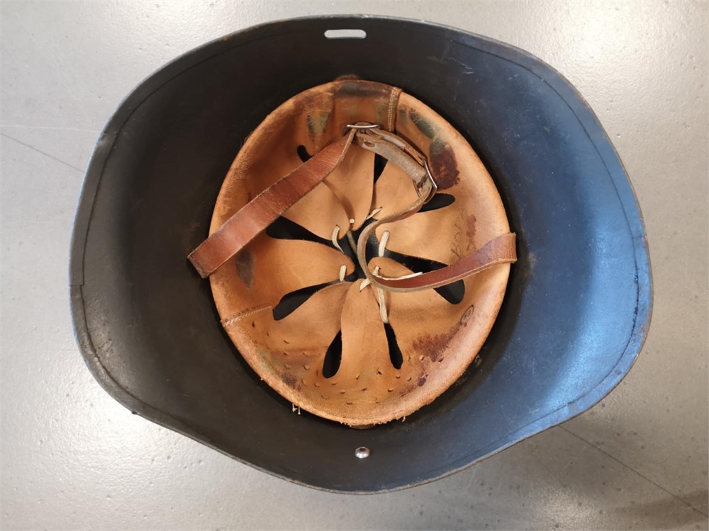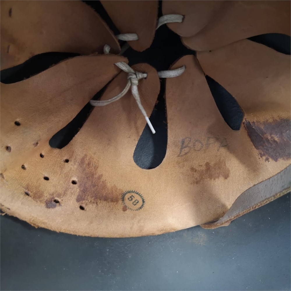 Hjelm, sandsynligvis fra 2. Verdenskrig, med læder og rem. Mærket "58" og påskrevet "BOPA" indvendigt i hjelmen. 29x26x18 cm.