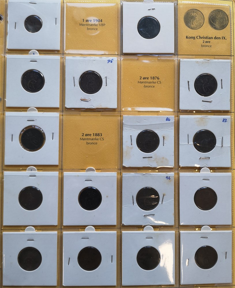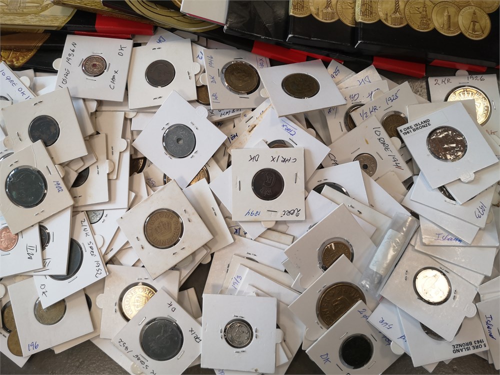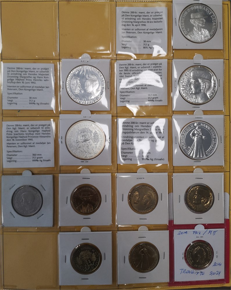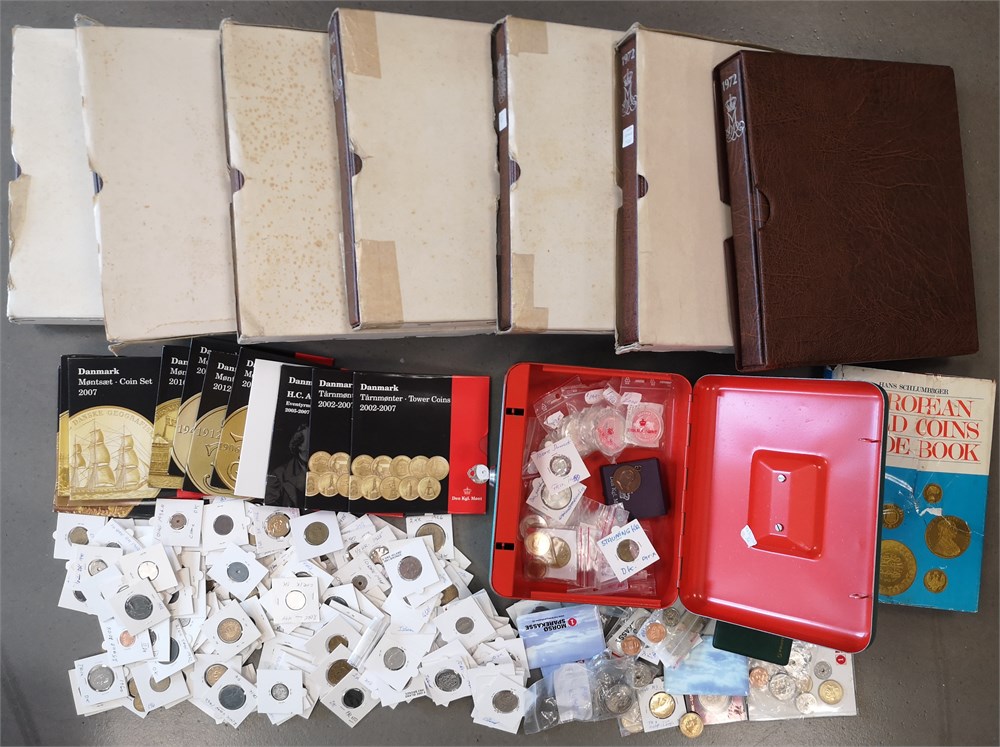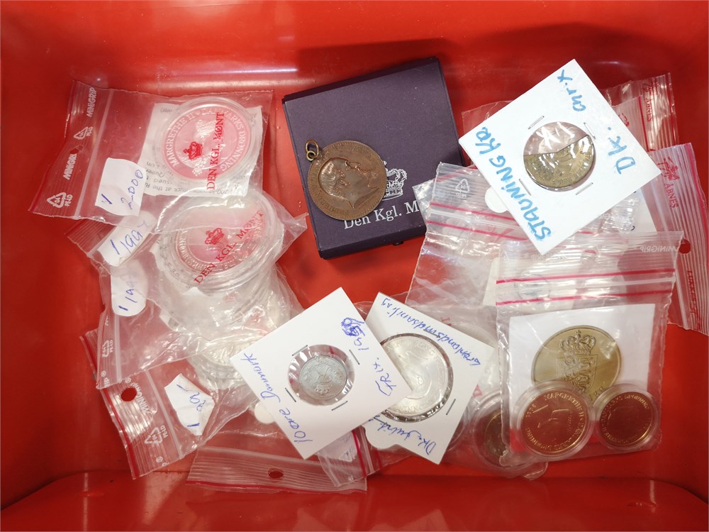 Samling i syv album inkl. 2 øre 1887, 1892; 10 øre 1959 (2); Erindringsmønter, Ag, 2 kroner 1953; 200 kroner 1990 (2), 1992 (3), 1995 (2), 1995 (2), 1997 (3), 2000 (2), 2004 (2); 500 kroner 2008, 2010 (2), 2012, 2015, 2017, 2020, 2022; Den Kgl. Mønt, møntsæt 2004, 2005, 2006, 2007, 2010, 2011, 2012, 2013, 2014, tårnmønter 2002-2007 (2), eventyrmønter 2005-2007 (alle møntsæt har beskadiget pap og/eller mønter); prøvemønter, 1 krone 1990 (3), 2 kroner 1990 (3); Fængselsvæsenet, 1, 2, 10, 25, 100 og 200 øre u. år (1949-1973); 'Stauning krone' (2); 5 øre 1941 med indslået hammer og stjerne. Derudover ca. 5.200 DKK i nye og gamle mønter.