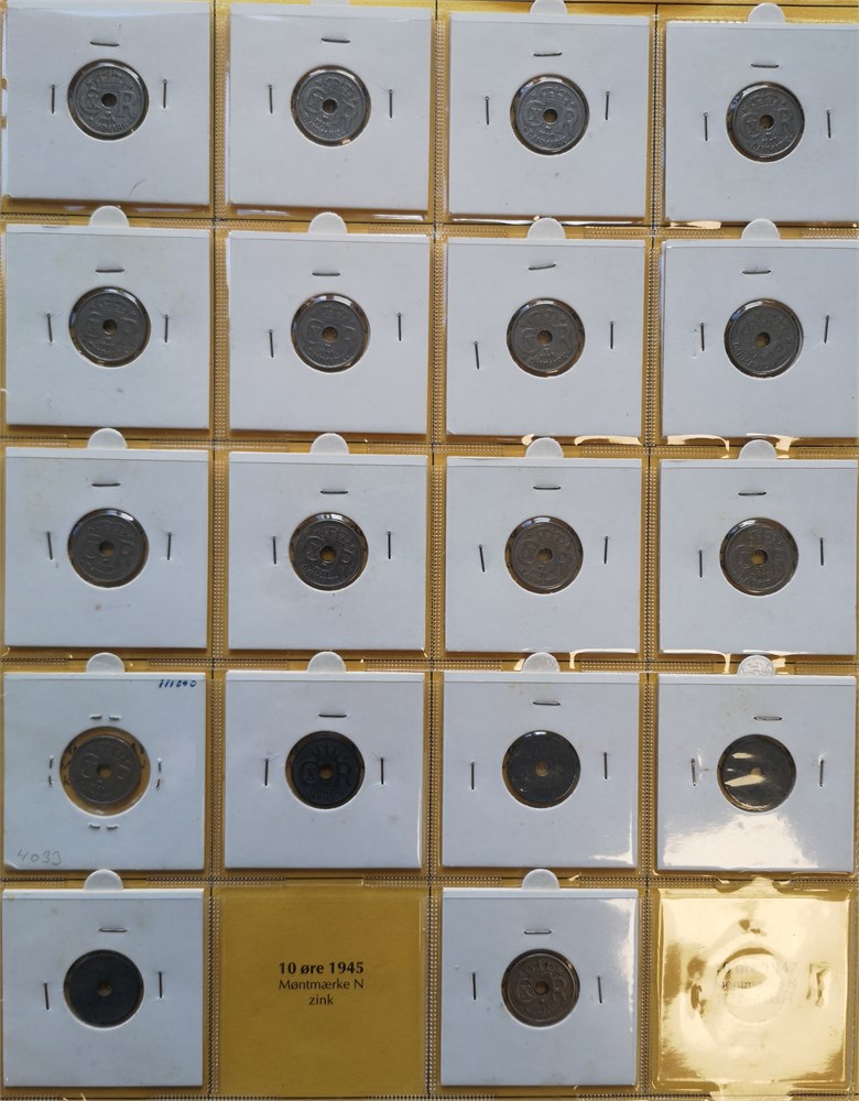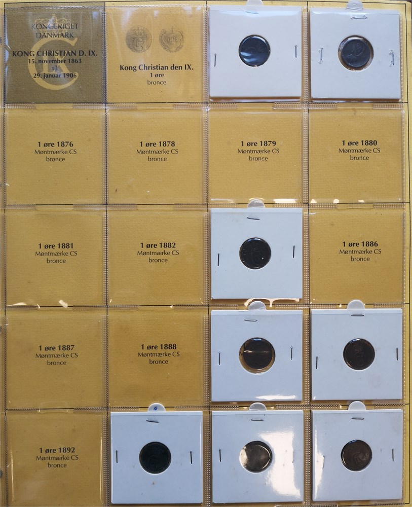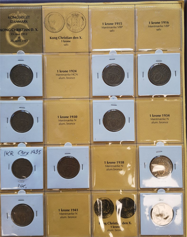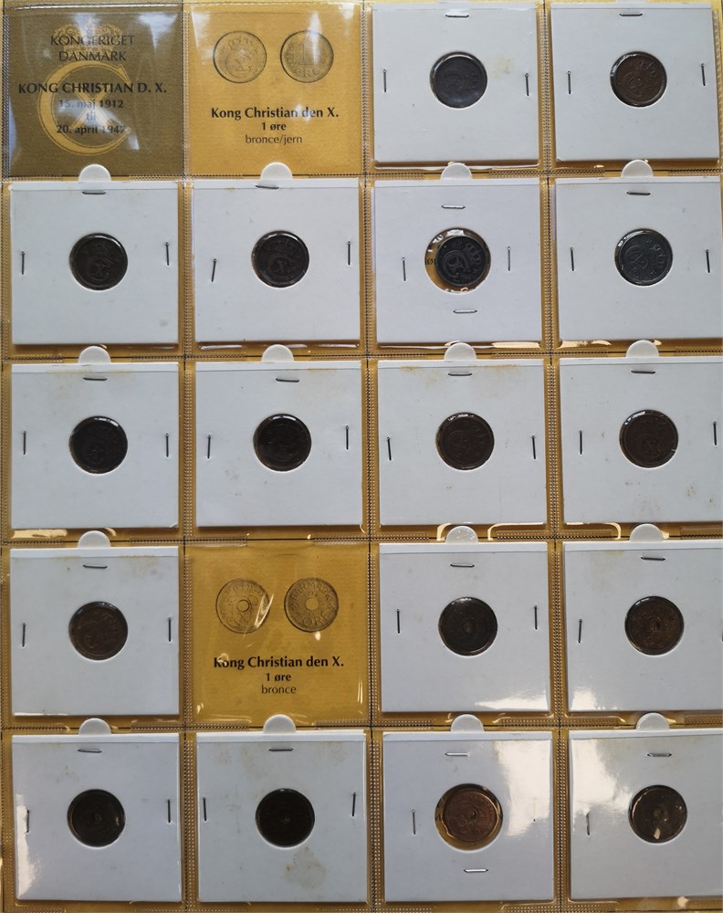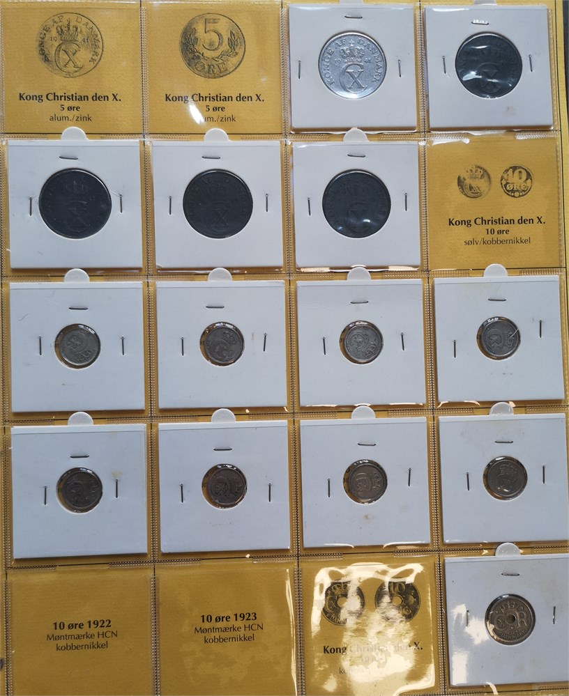 Samling i syv album inkl. 2 øre 1887, 1892; 10 øre 1959 (2); Erindringsmønter, Ag, 2 kroner 1953; 200 kroner 1990 (2), 1992 (3), 1995 (2), 1995 (2), 1997 (3), 2000 (2), 2004 (2); 500 kroner 2008, 2010 (2), 2012, 2015, 2017, 2020, 2022; Den Kgl. Mønt, møntsæt 2004, 2005, 2006, 2007, 2010, 2011, 2012, 2013, 2014, tårnmønter 2002-2007 (2), eventyrmønter 2005-2007 (alle møntsæt har beskadiget pap og/eller mønter); prøvemønter, 1 krone 1990 (3), 2 kroner 1990 (3); Fængselsvæsenet, 1, 2, 10, 25, 100 og 200 øre u. år (1949-1973); 'Stauning krone' (2); 5 øre 1941 med indslået hammer og stjerne. Derudover ca. 5.200 DKK i nye og gamle mønter.