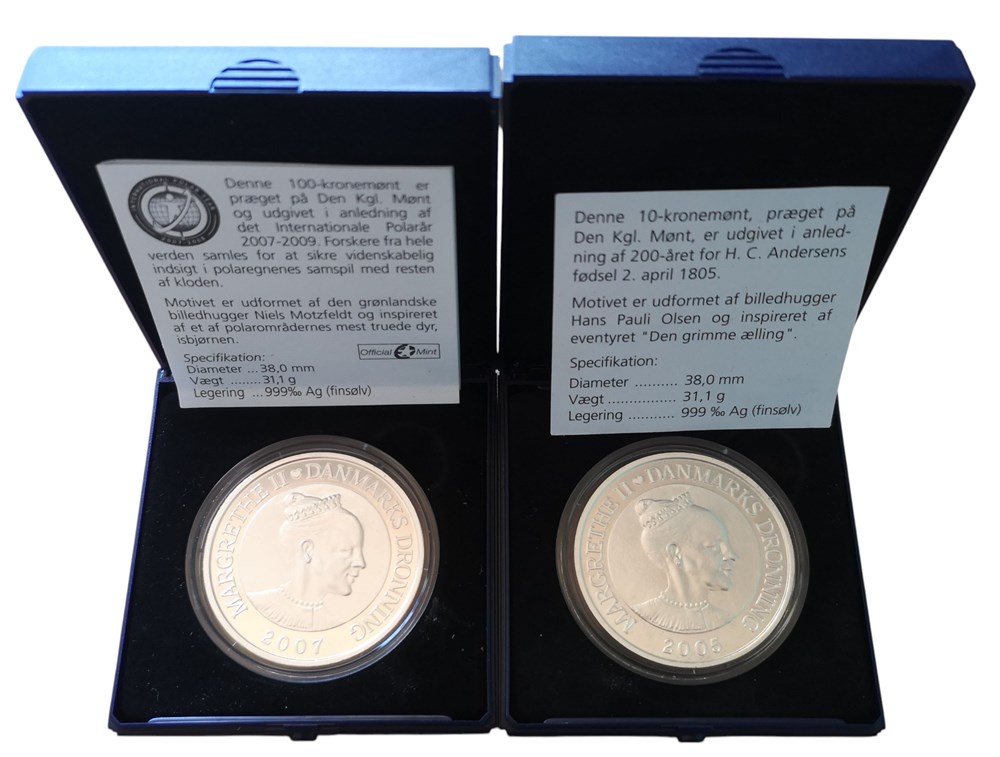 10 kroner 2005, Den Grimme Ælling; 100 kroner 2007, Isbjørn. 1 oz, Ag (999/1000). I originale kapsler og æsker, samt med certifikater. (2)