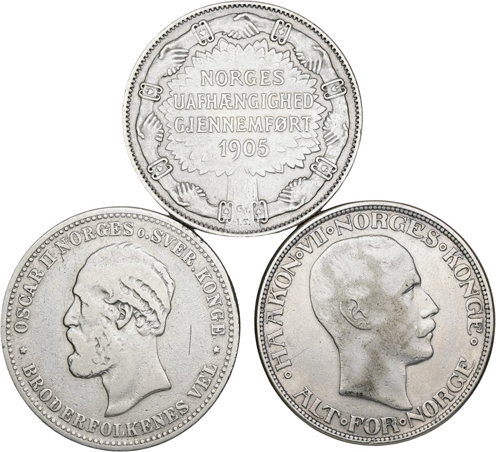 2 kroner 1878, 1907 (Norges uafhængighed; minimale monteringsspor), 1913. Alle er renset. (3)