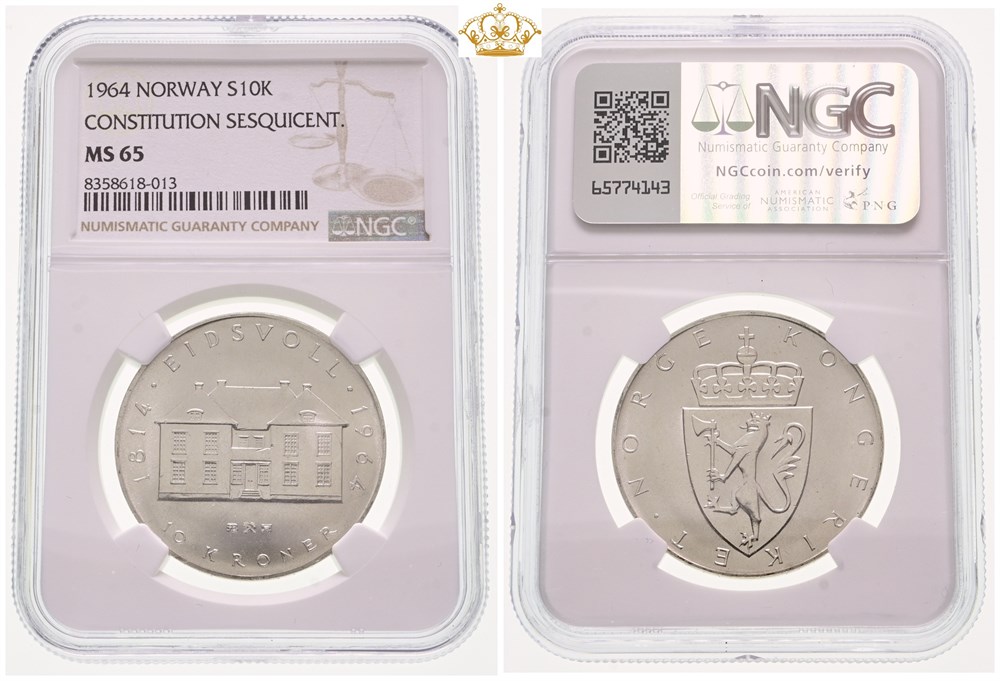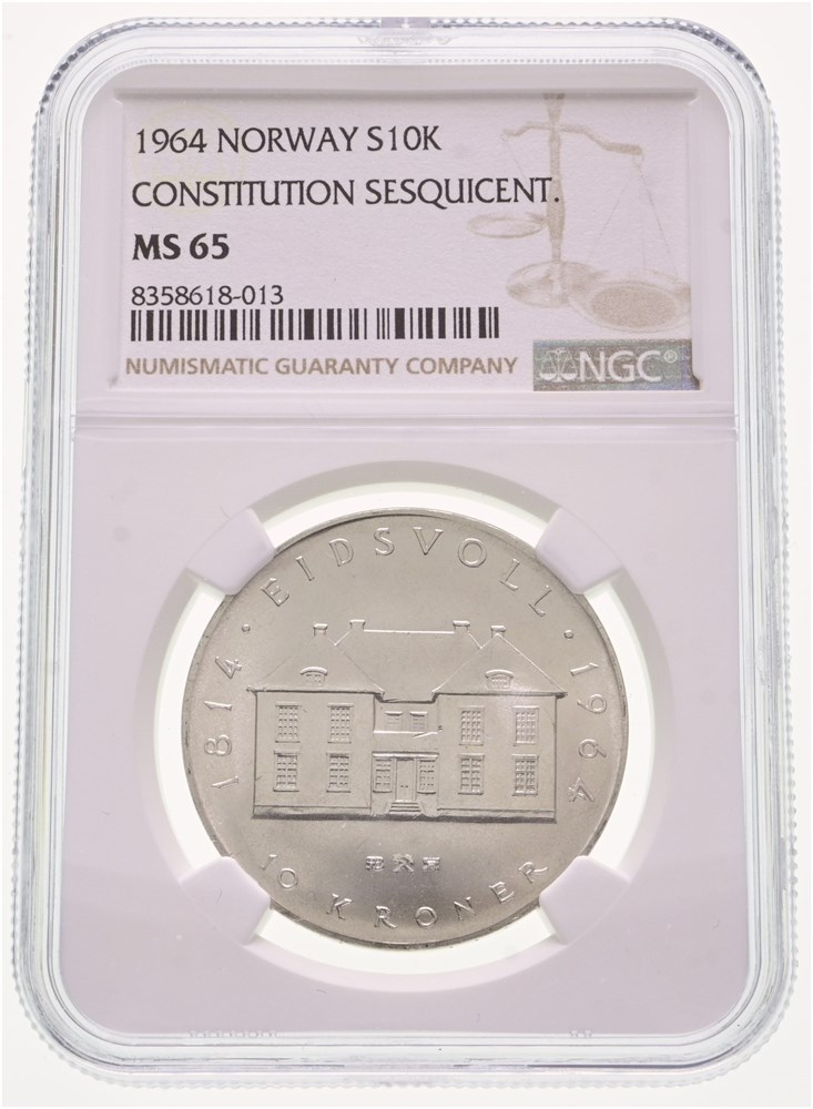 10 kroner 1964, 150 års grundlovsjubilæum - graderet MS 65 af NGC