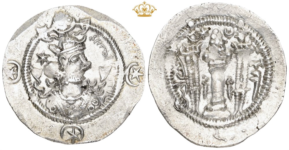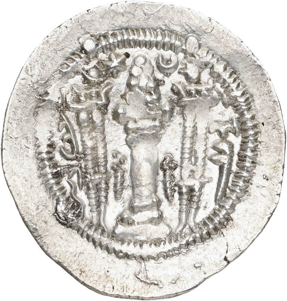 Drachm, year 13. Crowned bust right / Fire altar; attendants flanking.