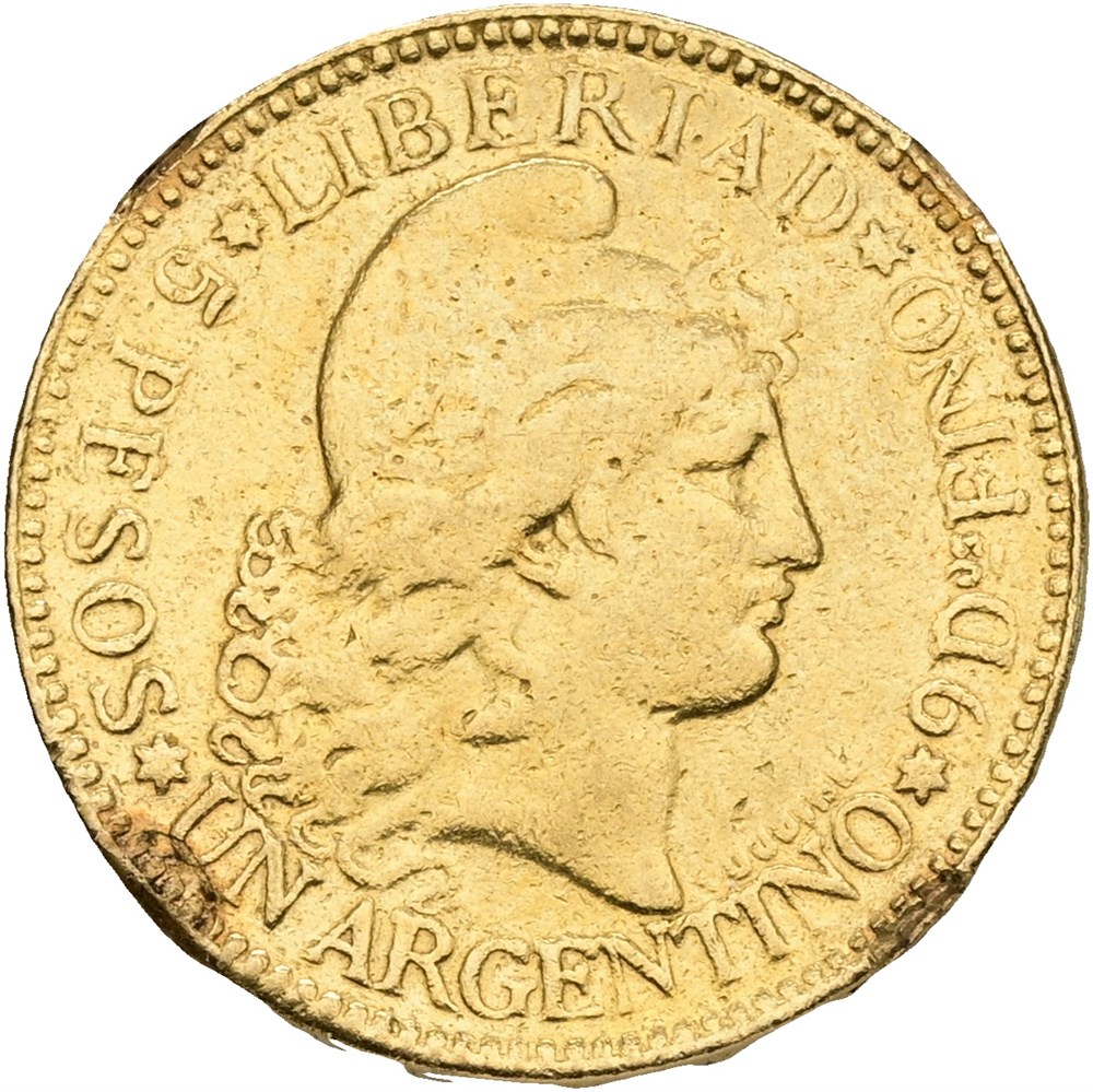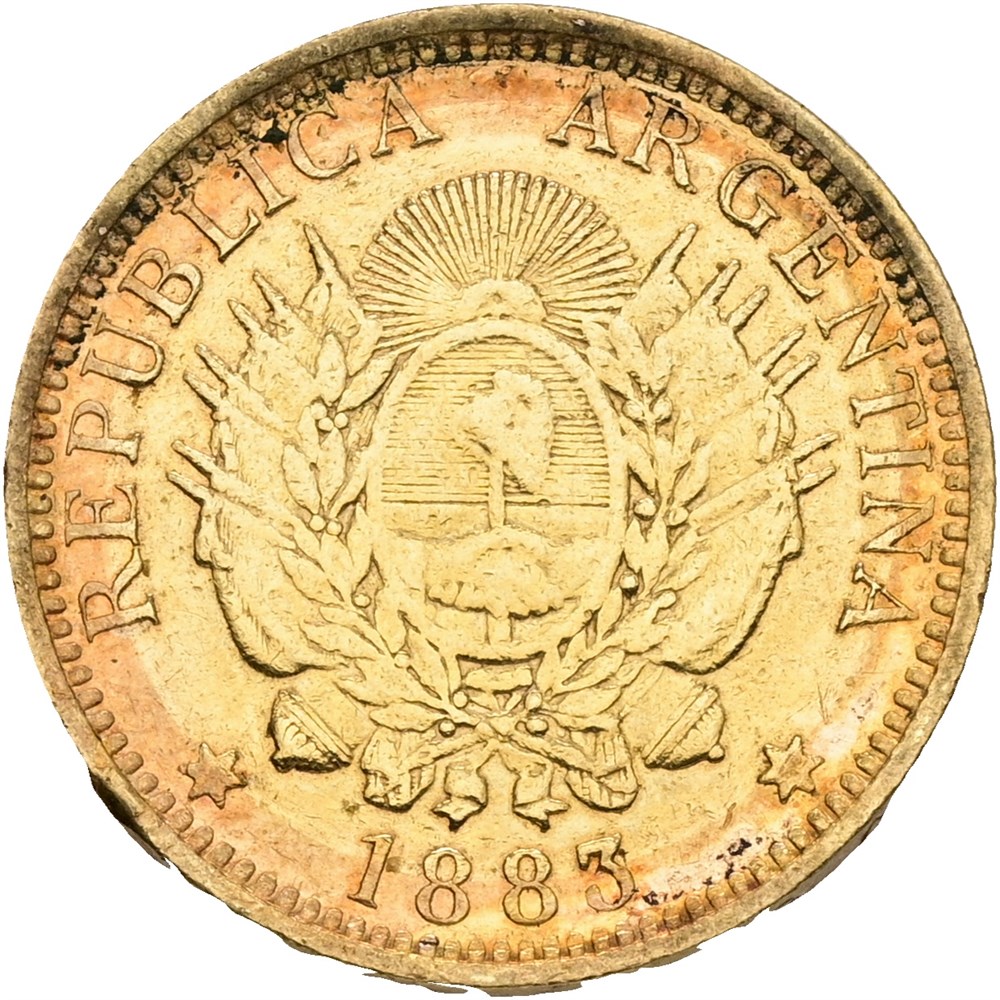5 Pesos / Argentino 1883, Au, marks from mounting, cleaned.