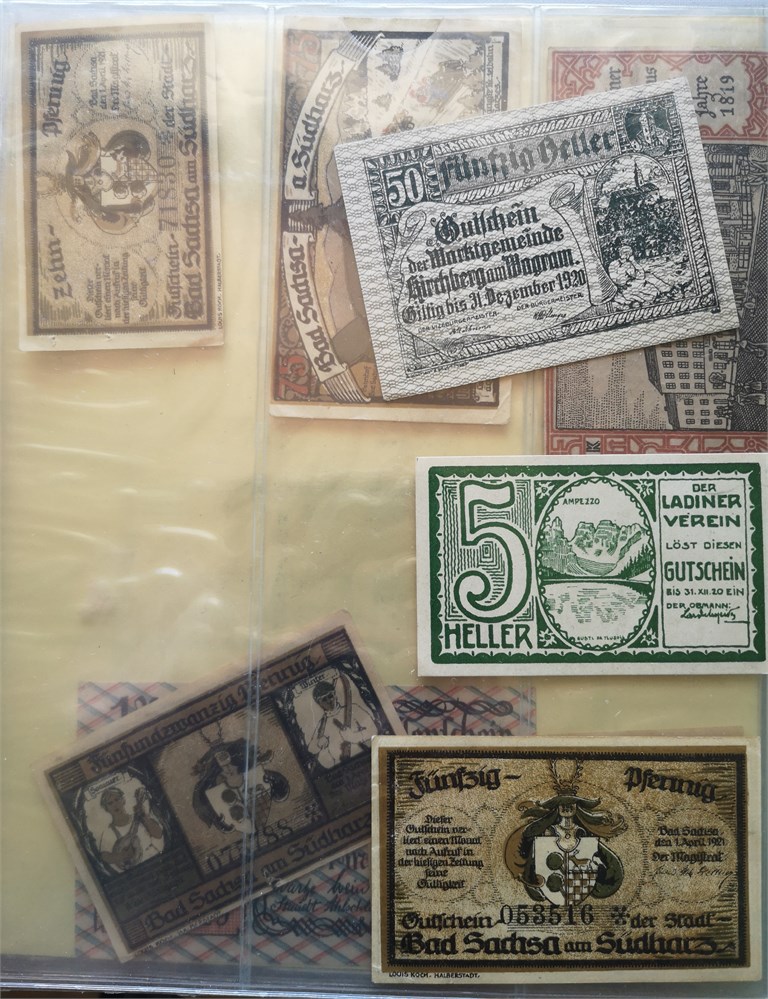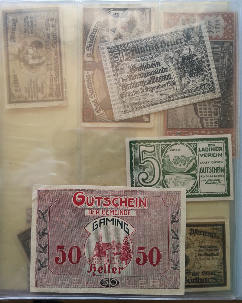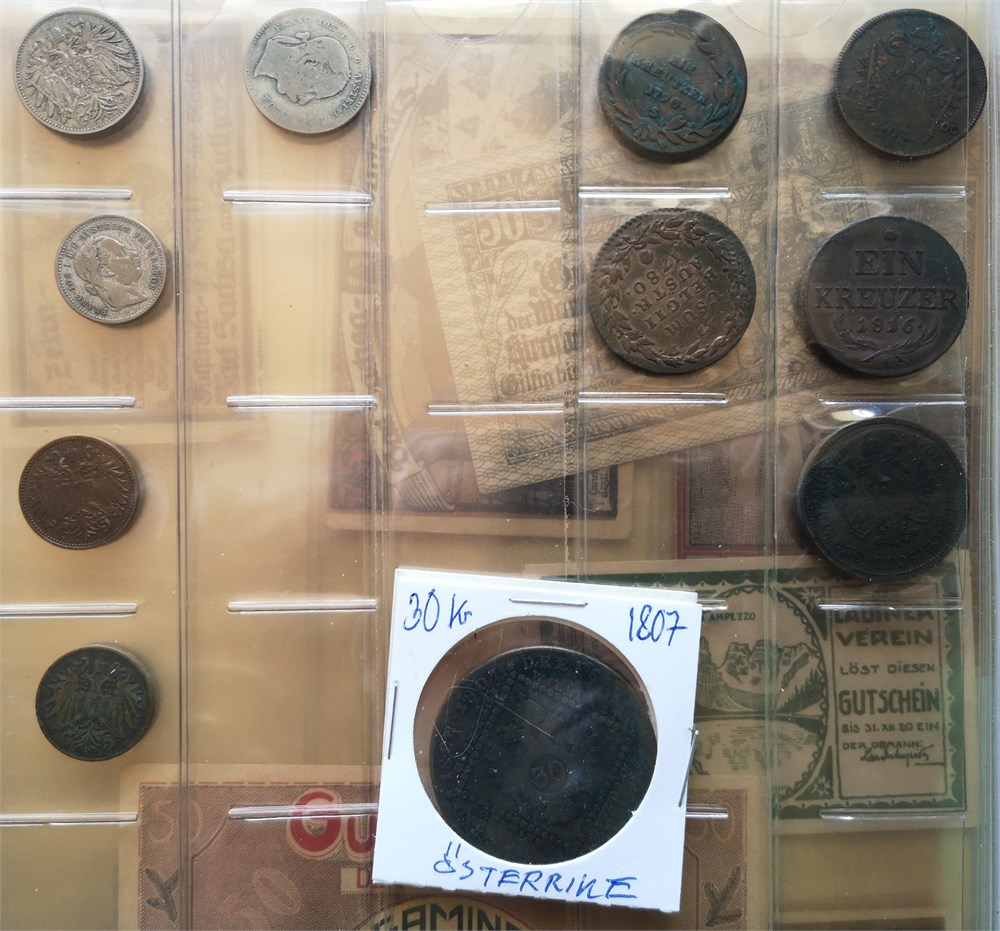 Collection coins and emergency paper money in album incl. Kreuzer 1790 S, 1800 A, 1816 A; 4 Kreuzer 1861 B; 30 Kreuzer 1807 A; emergency paper money, 37 pcs.; Austrian Netherlands, 2 Liards / Oorden 1780.