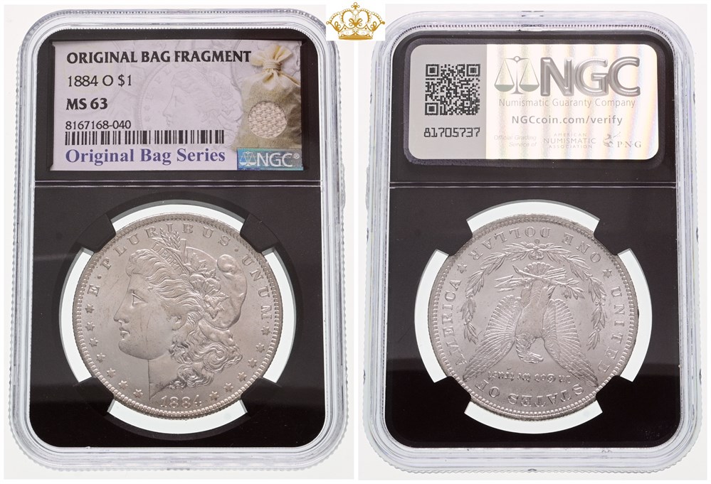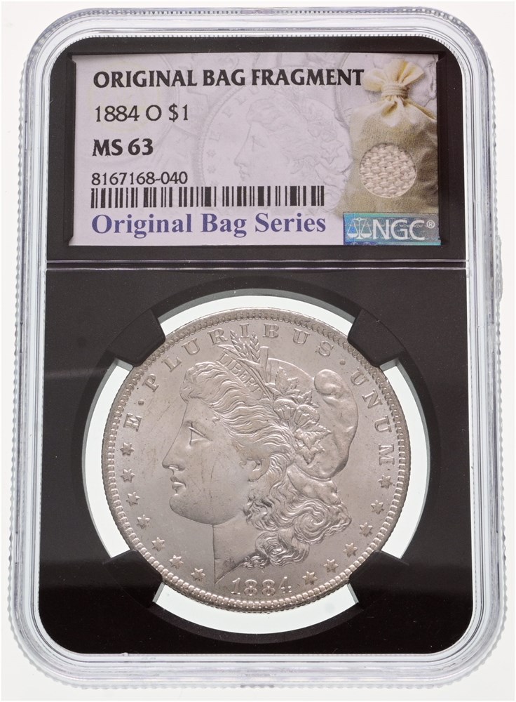 Dollar 1884 O - graded MS 63 by NGC, Original Bag Series with an original bag fragment.