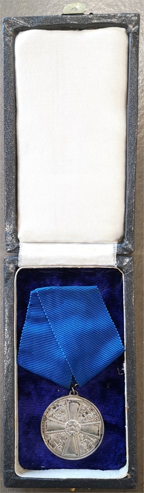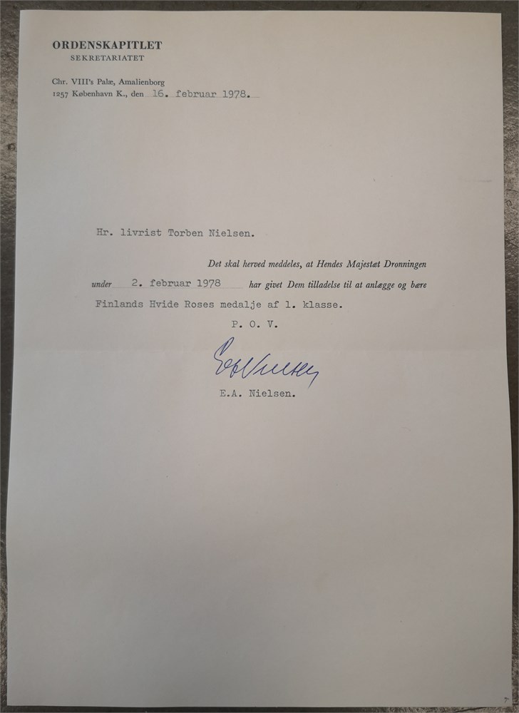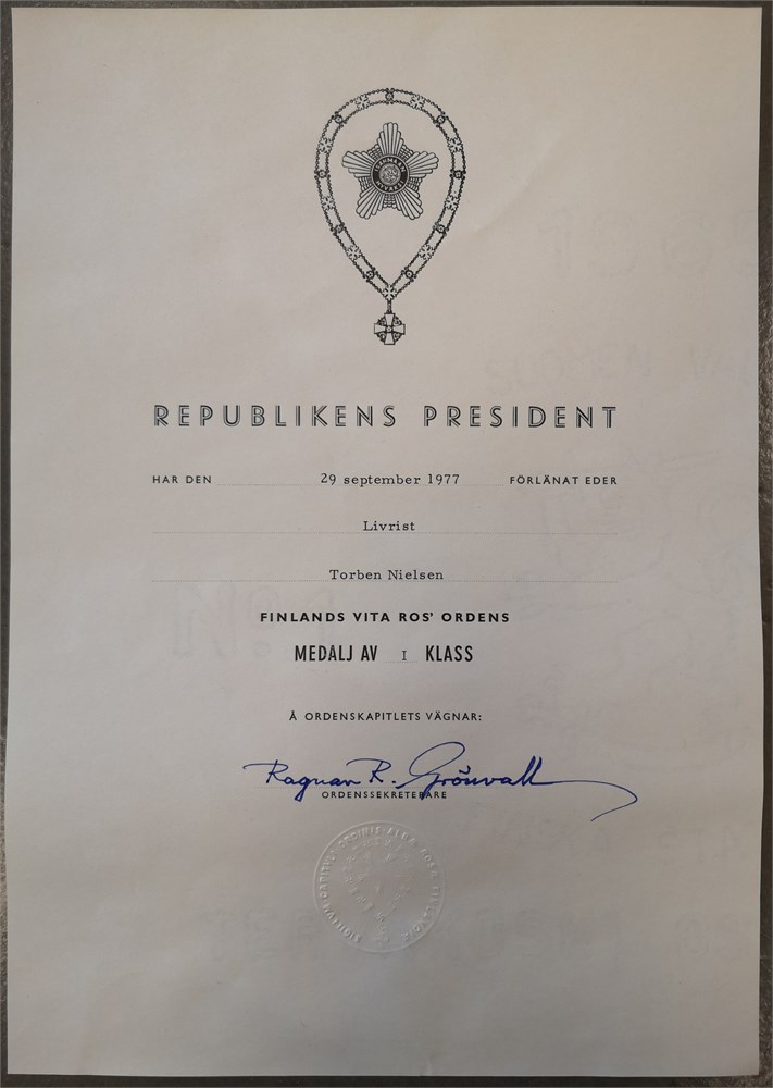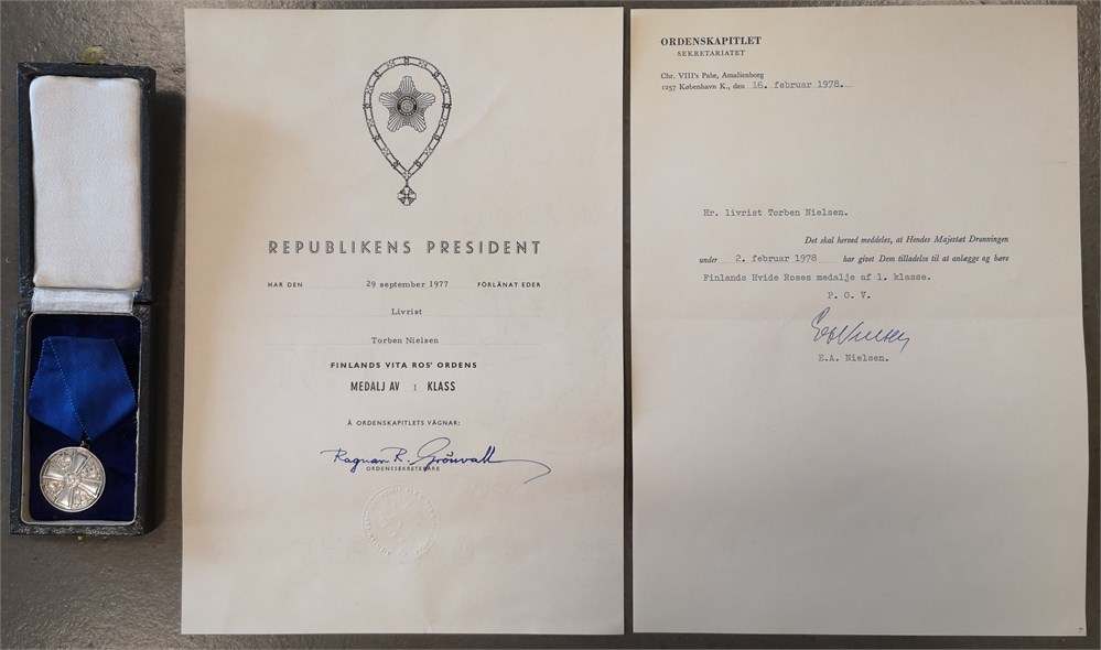 The Order of the White Rose of Finland, First Class, Ag, 30 mm, gently cleaned - with ribbon, box of issue and award document as well as document for carry permit in Denmark. Awarded to Torben Arne Nielsen, 29 September 1977.