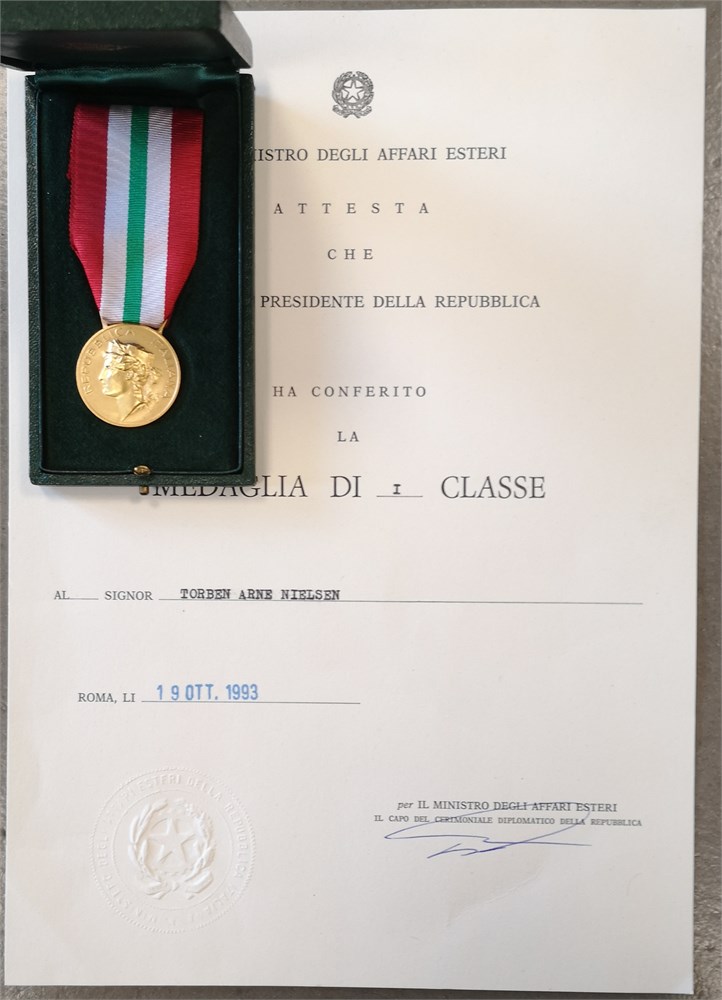 President Medal, First Class / 'Presidente Della Repubblica, Medaglia di I Classe', gilt Ag, 31 mm - with original ribbon, box of issue, and award document. Awarded to Torben Arne Nielsen, 19 October 1993.