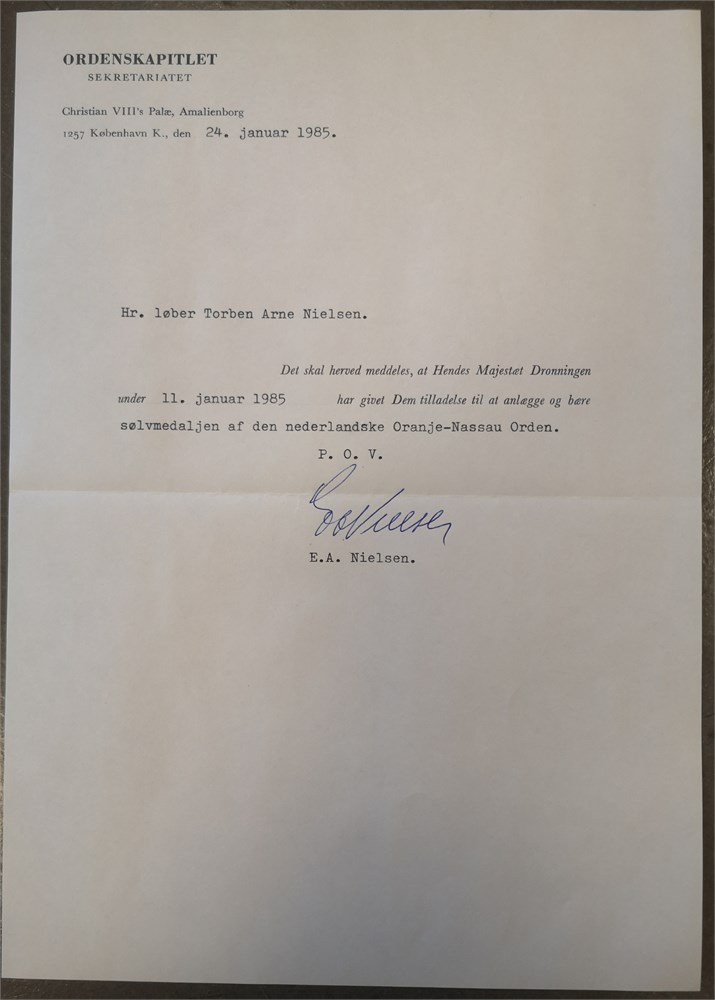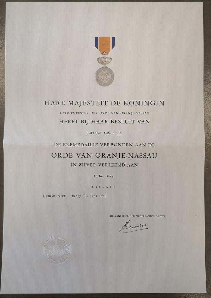Order of Orange-Nassau in silver / 'Orde van Oranje Nassau in zilver', Ag, 27 mm, gently cleaned - with original ribbon, box of issue and award document as well as document for carry permit in Denmark. Awarded to Torben Arne Nielsen, 3 October 1984.