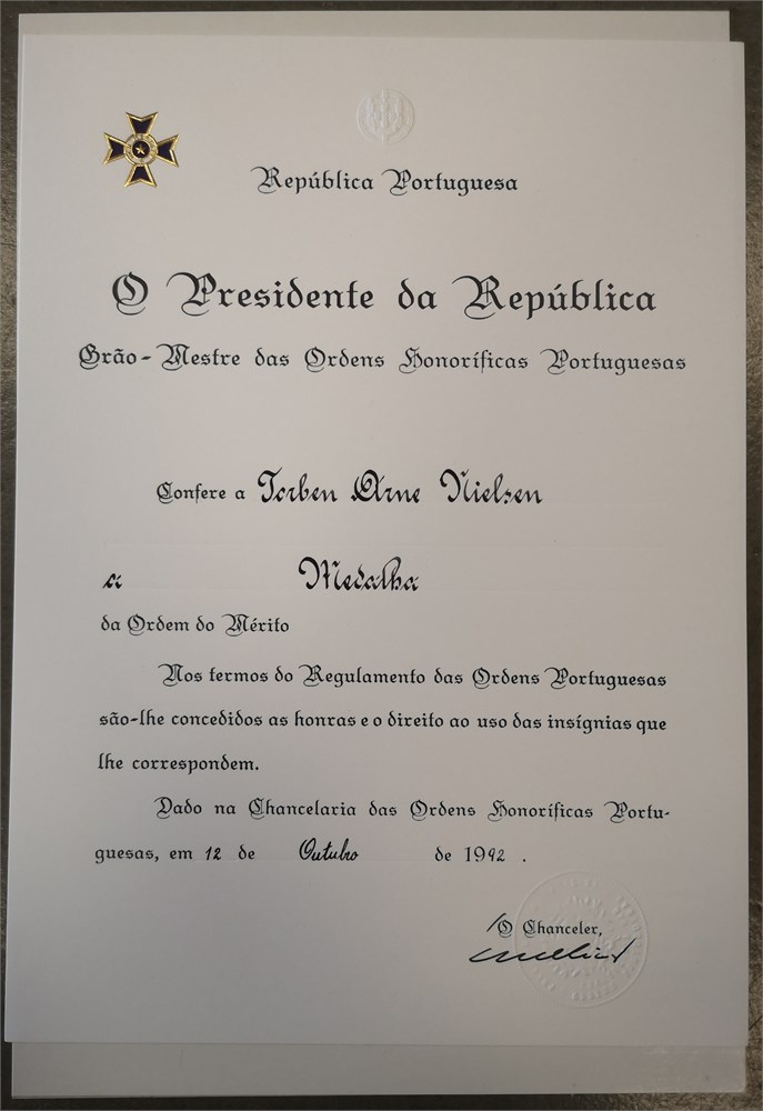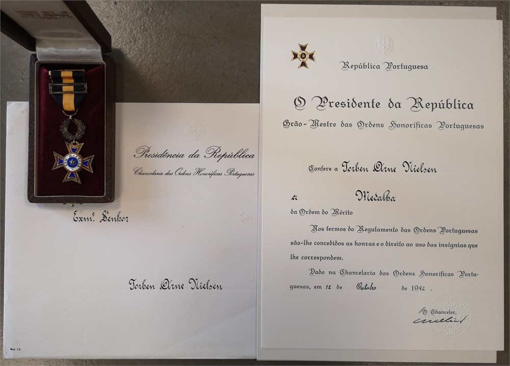 Order of Merit / 'Ordem do Mérito', enamelled Ae, 38 mm - with original ribbon, box of issue, and award document. Awarded to Torben Arne Nielsen, 12 October 1992.