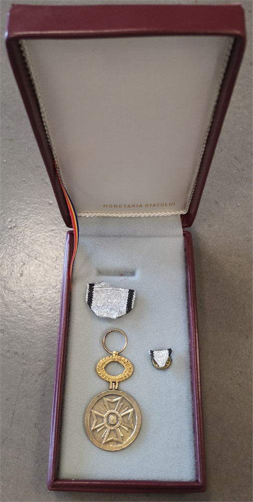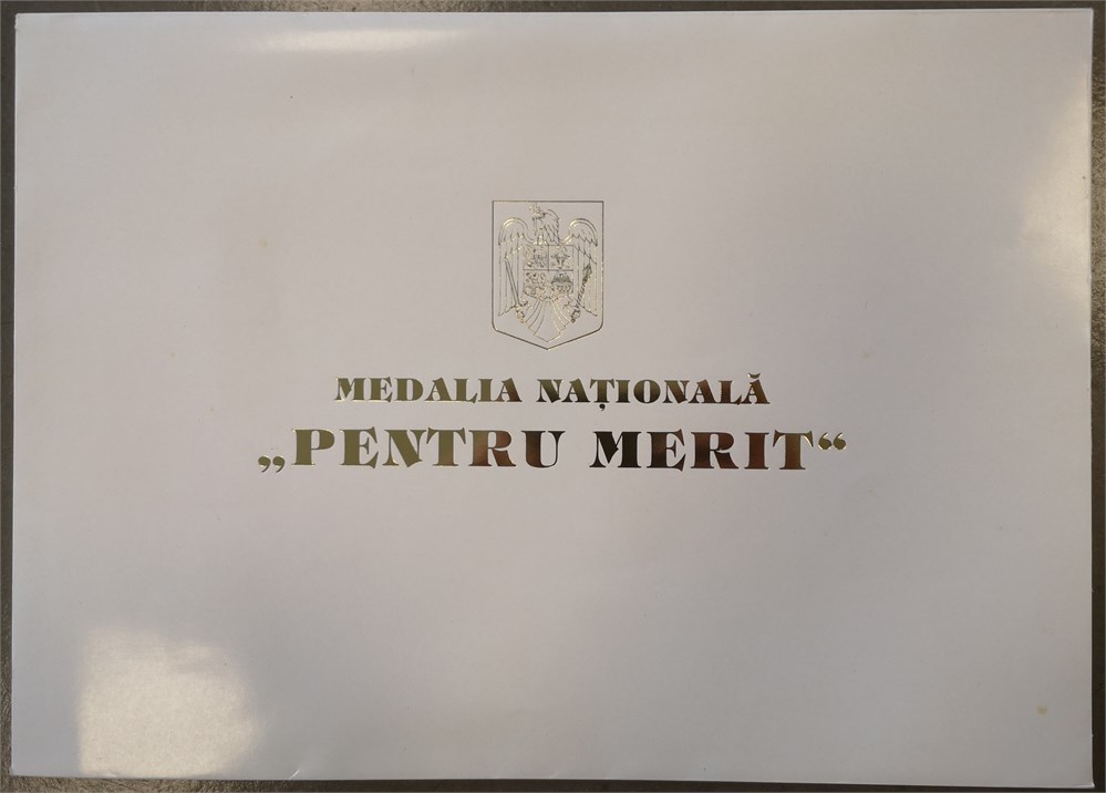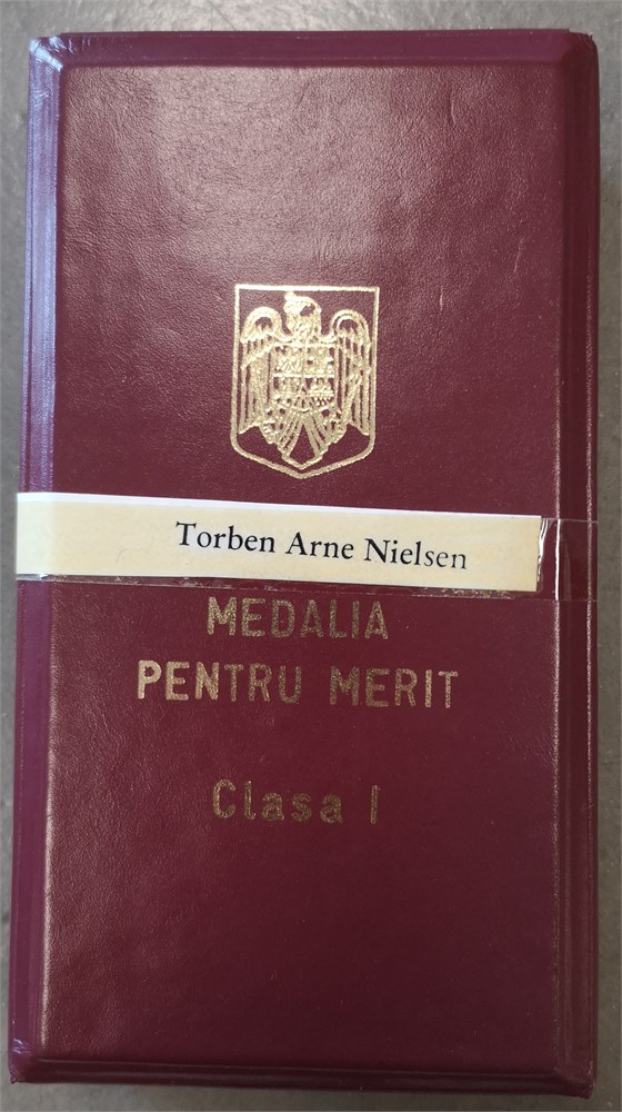 National Medal For Merit, First Class / 'Medalia națională "Pentru Merit", Clasa I', Ae, 35 mm - with original box of issue, pin and award document. Awarded to Torben Arne Nielsen, 23 May 2000.