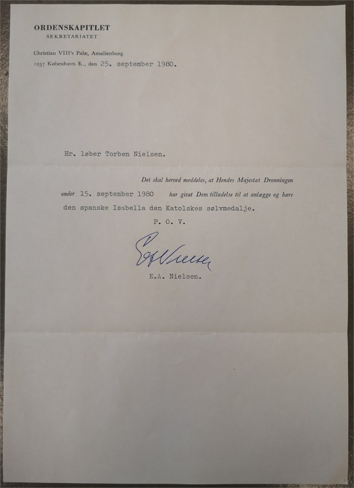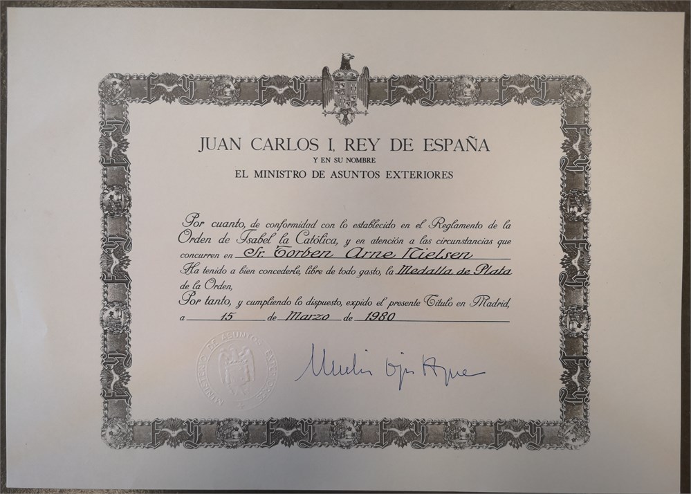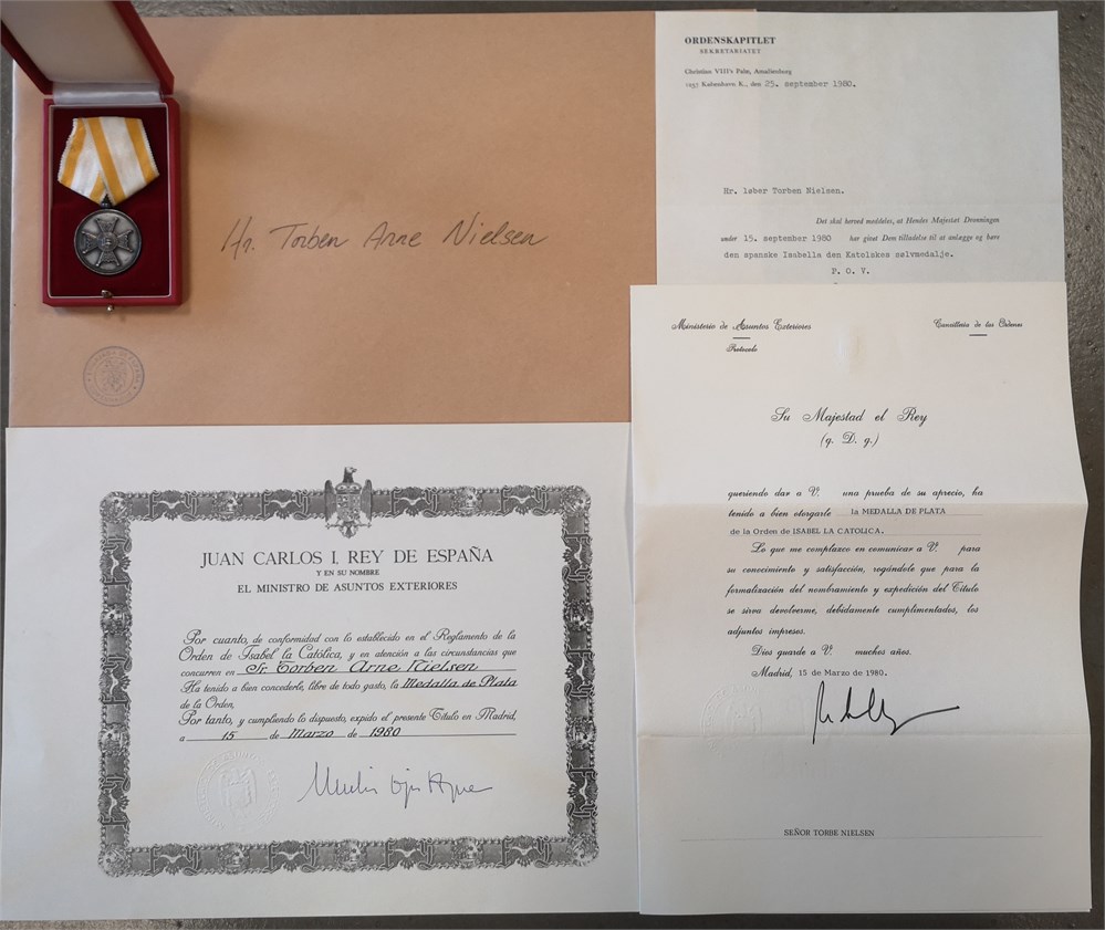 Order of Isabella the Catholic, Silver Medal / 'la Medalla de Plata de la Orden de Isabel la Catolica', Ag, 38 mm - with original ribbon, box of issue and award document as well as document for carry permit in Denmark. Awarded to Torben Arne Nielsen, 15 March 1980.