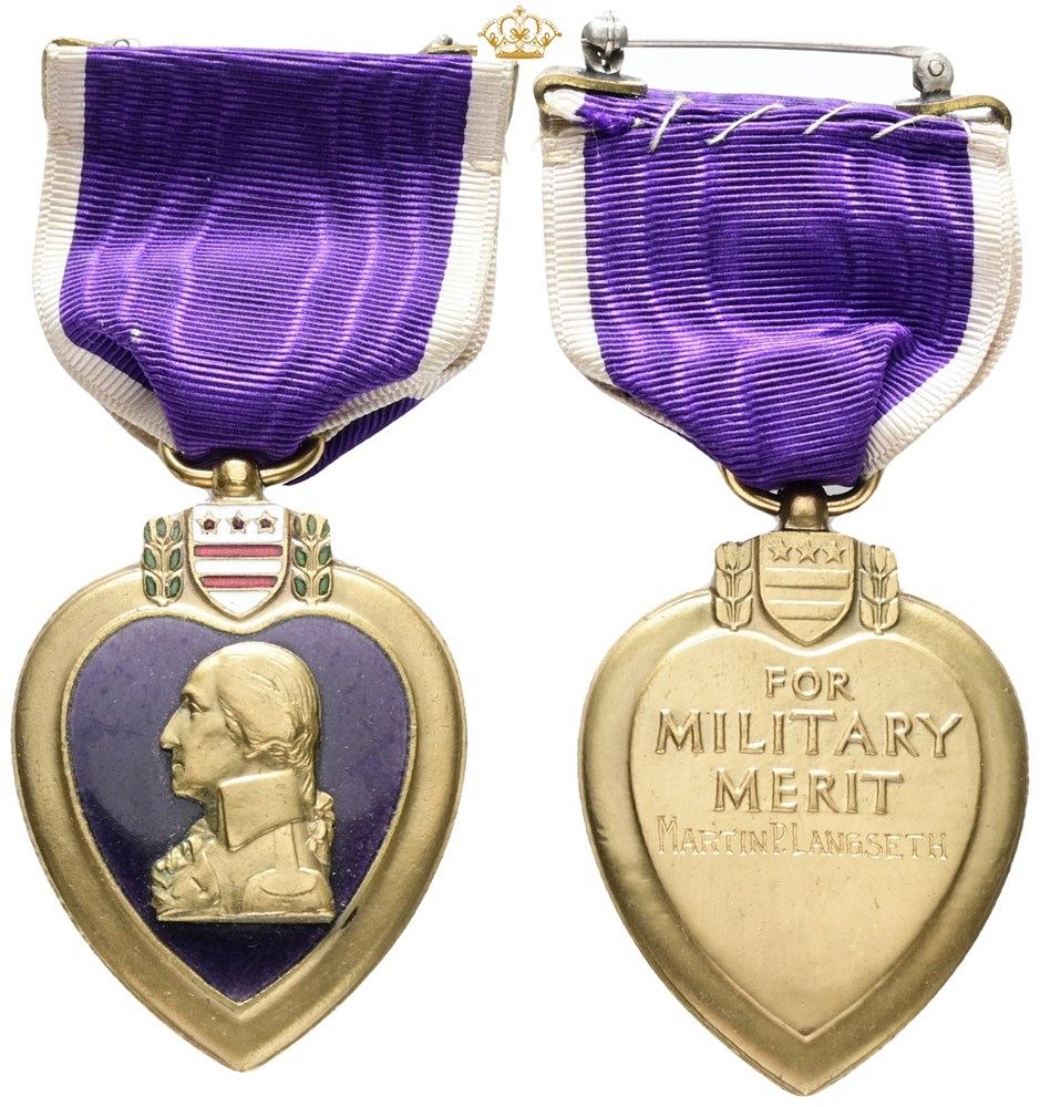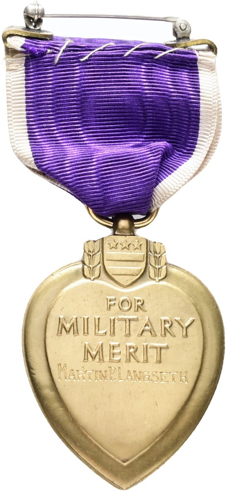 Purple Heart, enameled Ae, with ribbon - awarded to Martin P. Langseth, no. 59701 stamped into the edge.