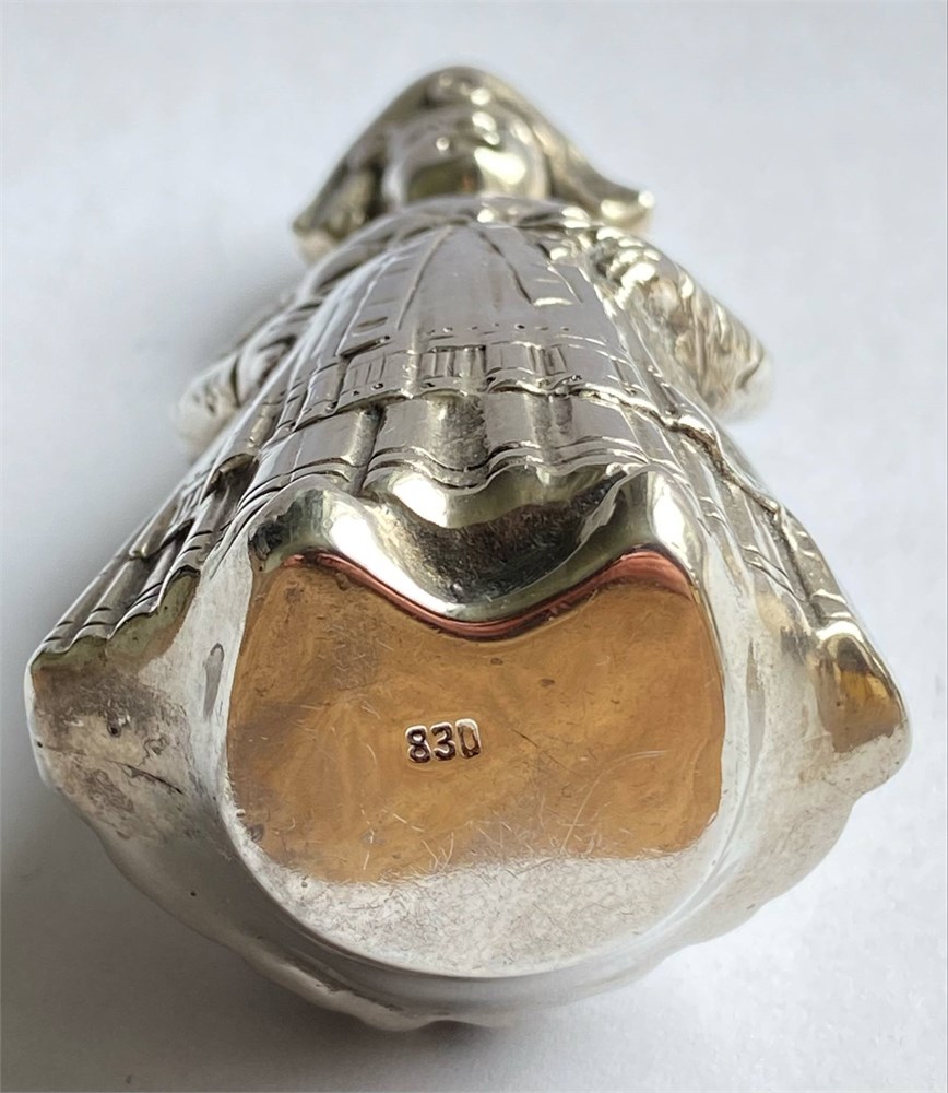 Salt og peber figurer, Ag, mand (800/1000), dame (830/1000) og barn (925/1000), bunden af manden er antageligvis udført i forsølvet messing.