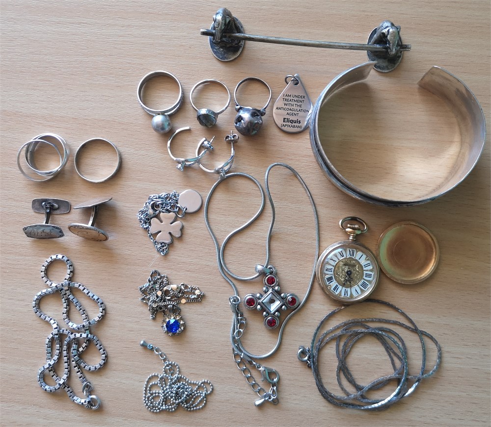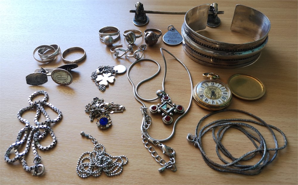 Fingerringe, armring, halskæder, øreringe, vedhæng og lommeur. Nogle af Ag. Samlet vægt for Ag med stempler: 23 g. Enkelte af smykkerne fremstår defekte.