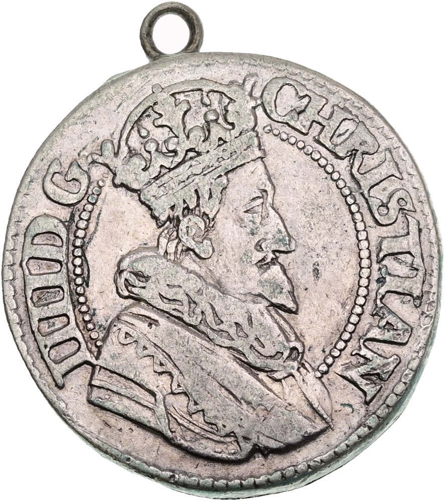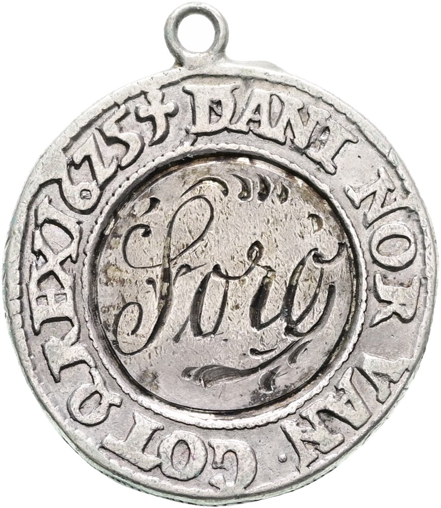 1/2 krone 1625, omdannet til 'love-token', hængt, graffiti på randen.