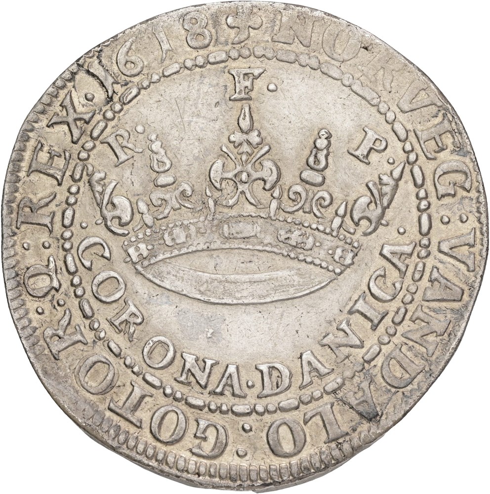 Corona Danica, dobbeltkrone 1618, lille graffiti på forsiden.