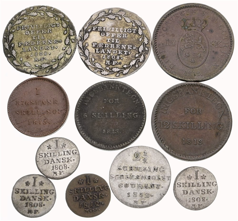 Skilling 1808 (3), 1812; rigsbankskilling 1813; 6 skilling 1813; 12 skilling 1812, 1813; 1/24 speciedaler 1812; 1/6 rigsdaler 1808, 'offermark', monteringsspor (2). (11)