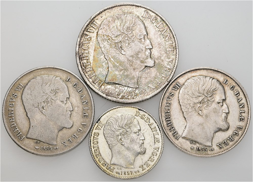 16 skilling 1857, 1/2 rigsdaler 1854, 1855 samt rigsdaler 1855. (4)