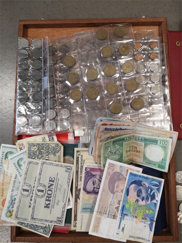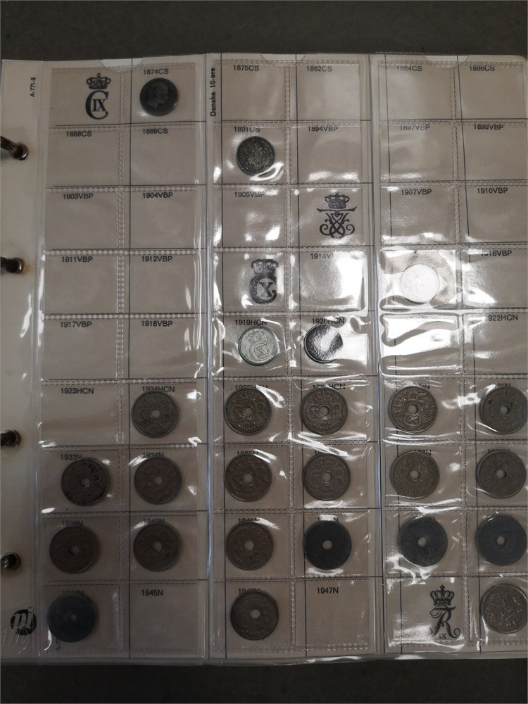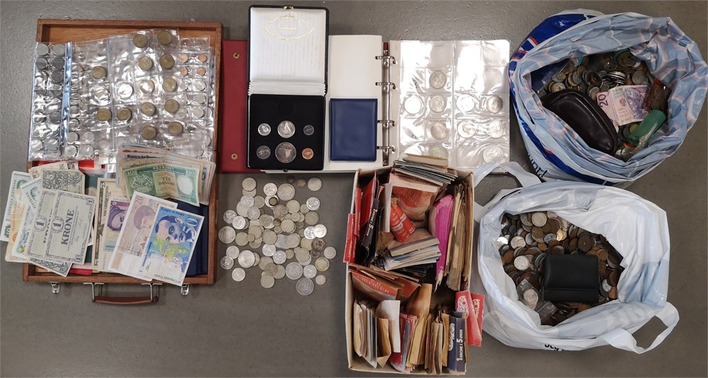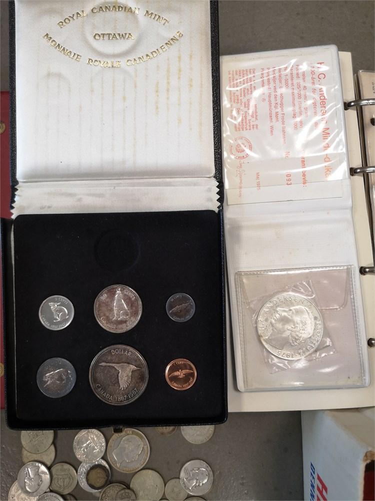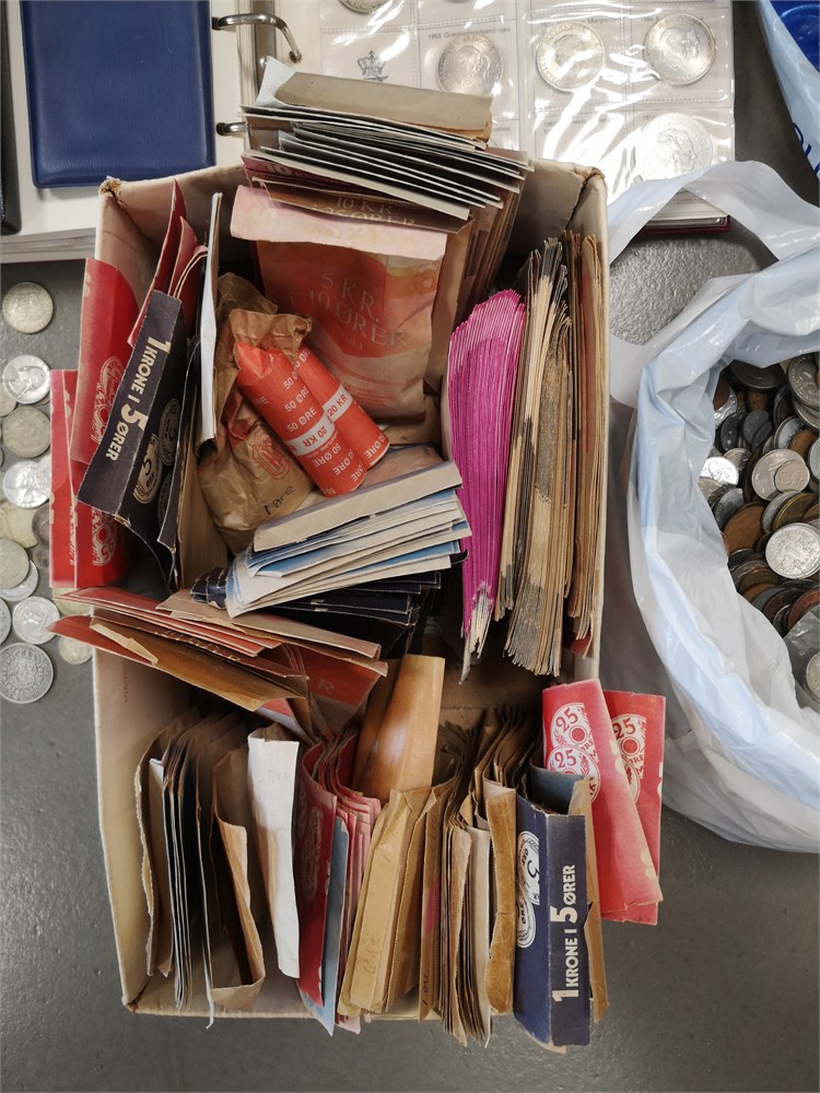 Collection incl. Denmark, 10 øre 1959; 1 krone 1875, 1915; 2 kroner 1875, 1876, 1915, 1924; commemorative coins, Ag, 1906, 1923, 1930, 1937, 1945, 1953, 1958, 1960, 1964, 1967, 1972; 1 krone 1921 2O (2); prison tokens, 1 øre, 2 øre (9), 10 øre (5); H. C. Andersen medal, Ag (925/1000), 24 g; Norway, 2 skilling 1664; 2 kroner 1893; Canada, 1, 5, 10, 25, 50 Cents and Dollar 1967; Germany, 10 Mark 1993; USA, 5 Dollars 2006. In addition c. 440 g Ag. In total c. 30 kg