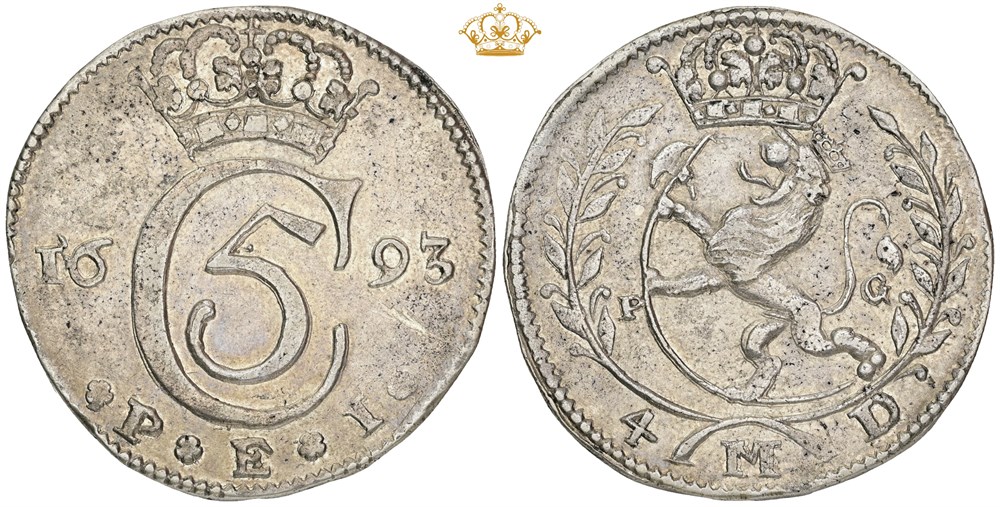 4 mark 1693, svagt ejermærke over '93', ridse.
