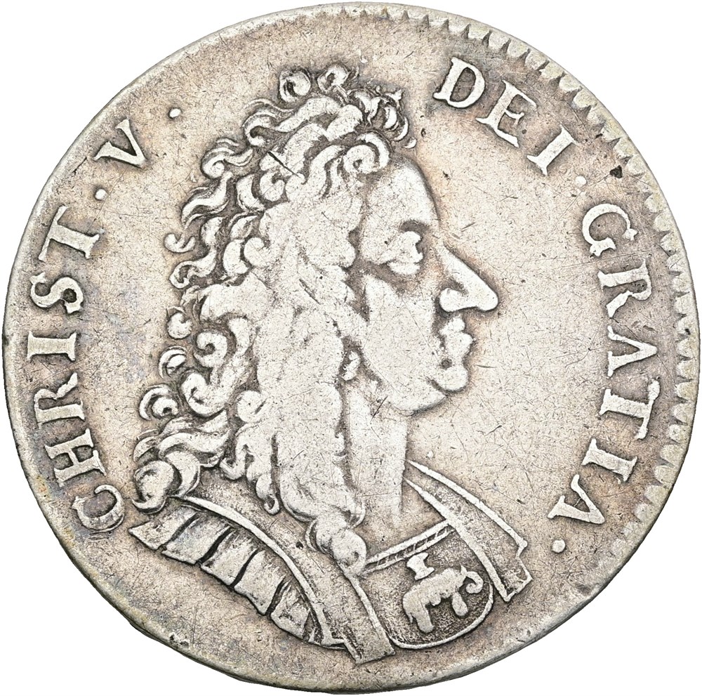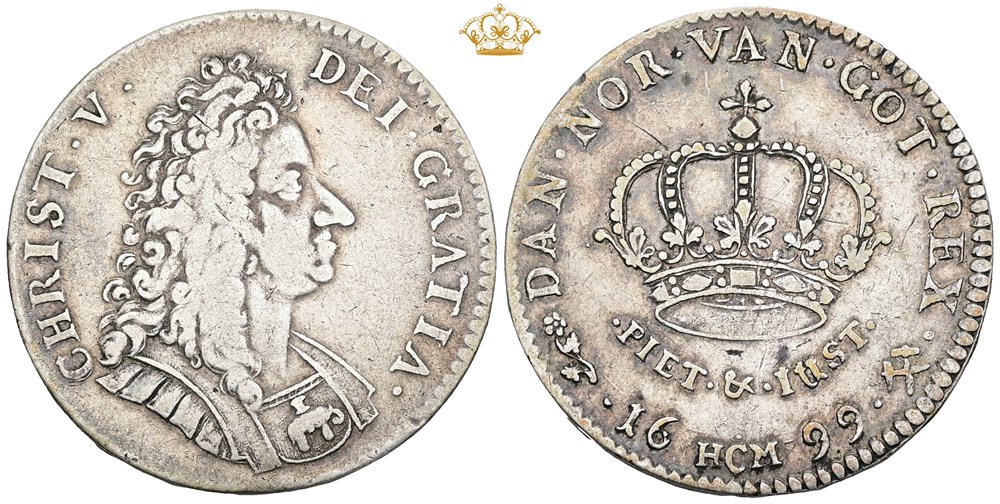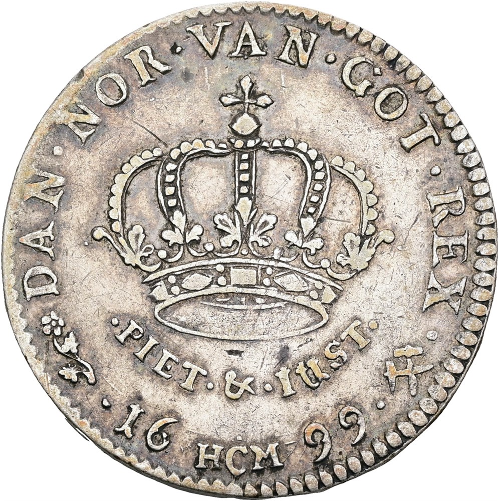 Krone 1699, renset, mindre filespor på randen - med randskriften "SERVANT ET DECORANT".