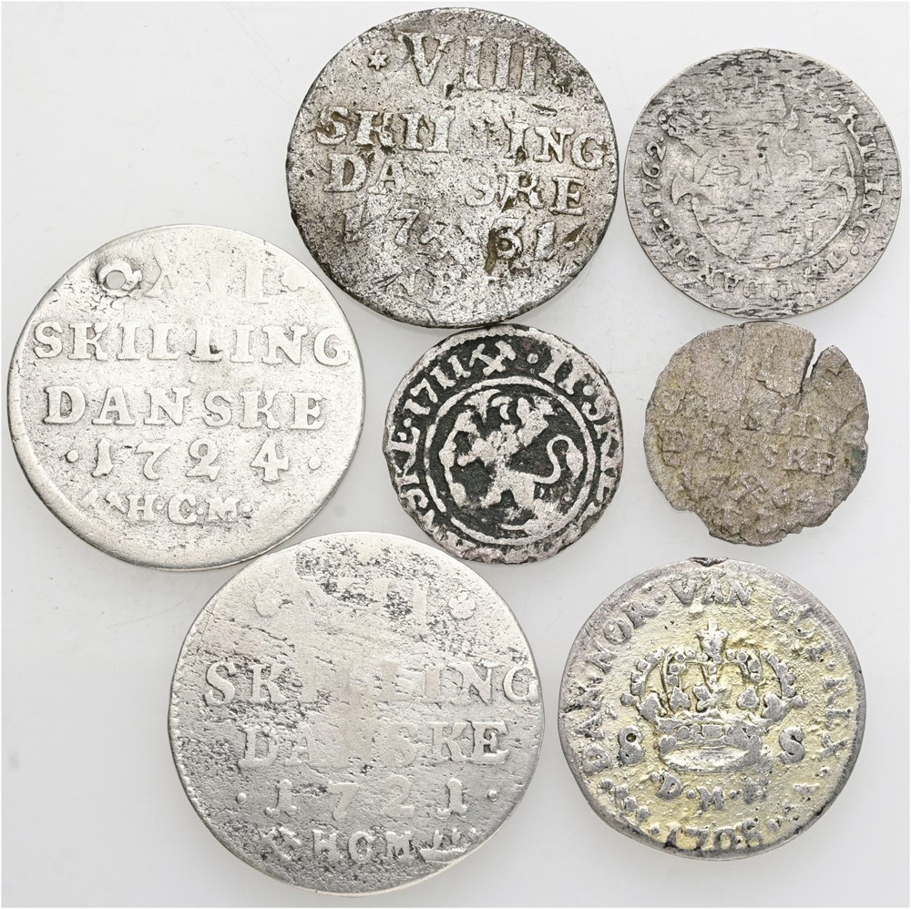 Skilling 1764; 2 skilling 1711, 1762; 8 skilling 1708, 1731; 12 skilling 1721, 1724. Diverse anmærkninger. (7)