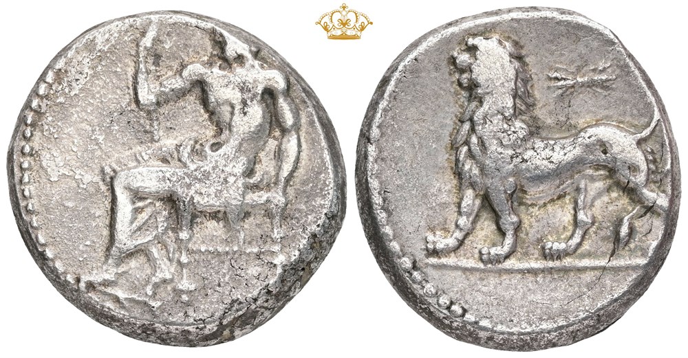 Satraps of Babylon, circa 328/3-311 BC. Double shekel / Stater. Baal seated left, holding scepter / Lion standing right; thunderbolt above. Corr. Rare.