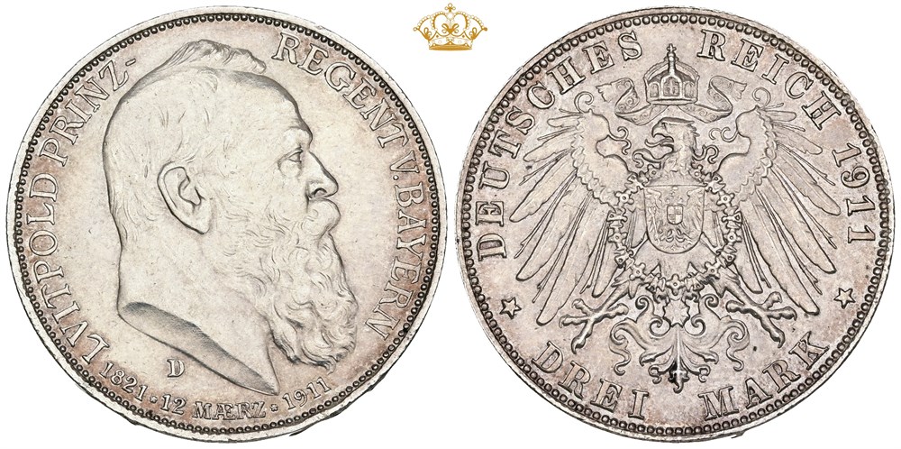 3 Mark 1911 D, 90th Birthday of Prince Regent Luitpold.
