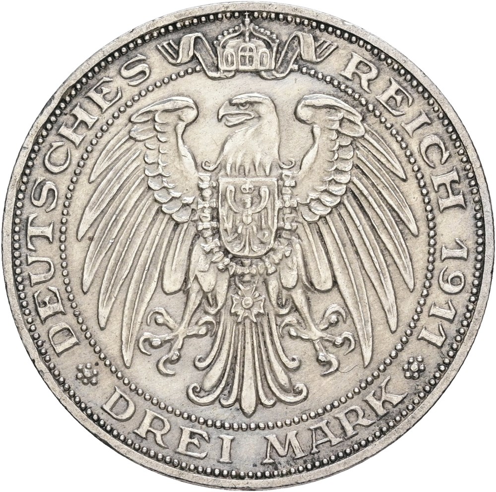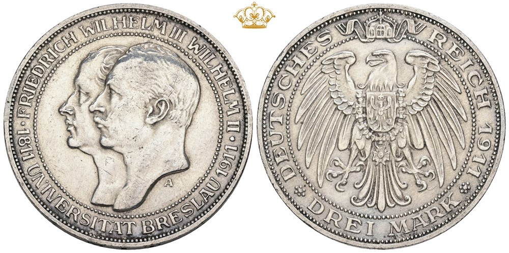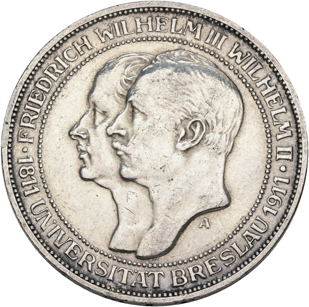 3 Mark 1911 A, University of Wrocław, cleaned, obverse edge filing.