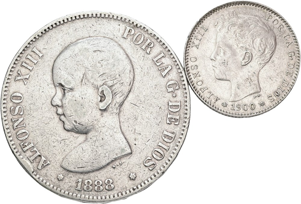 1 Peseta 1900 (00); 5 Pesetas 1888 (88), edge nick. (2)