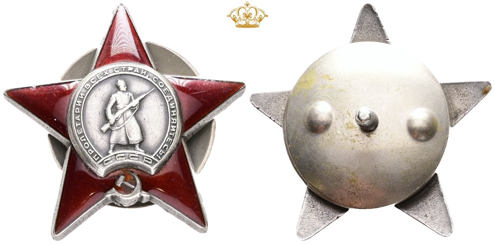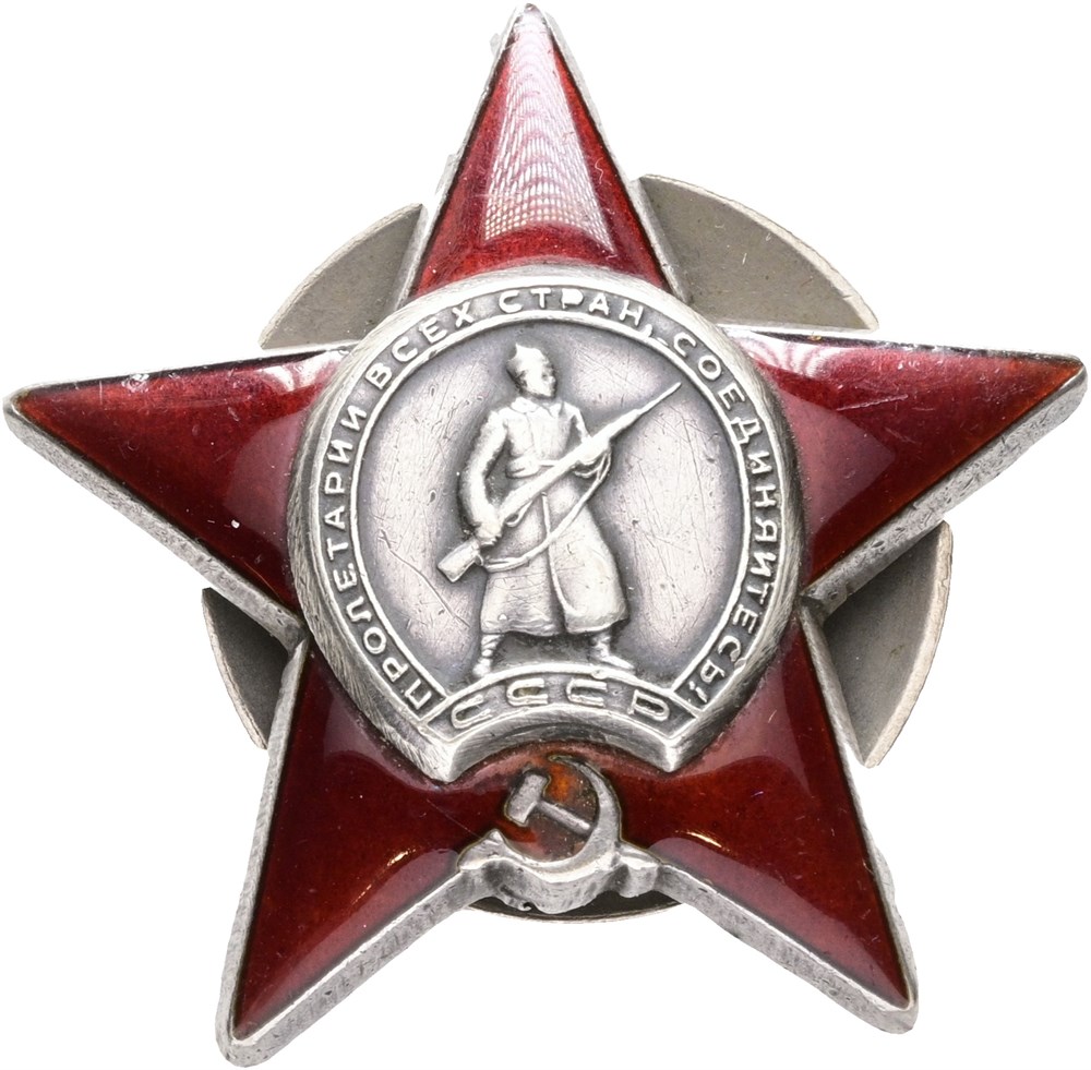 Order of the Red Star, Ag with red enamel, 45 mm, stamped "МОНЕТНЫЙ ДВОР" and engraved no. "2732015" on the reverse.