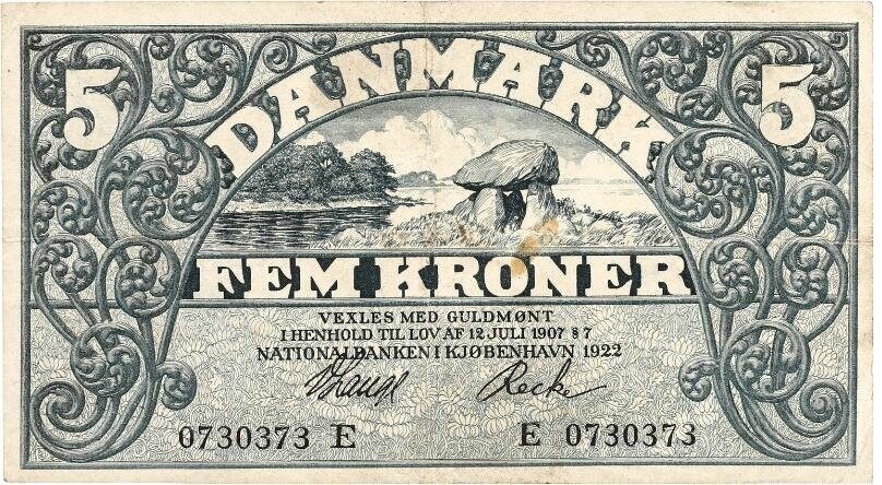 5 kroner 1922 E, nr. 0730373, V. Lange / Recke.