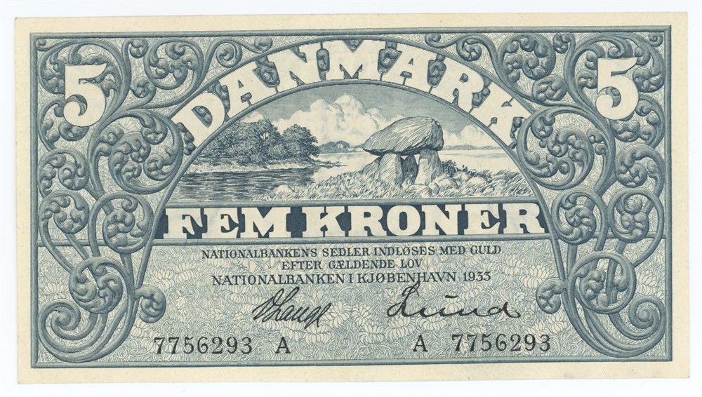 5 kroner 1933 A, nr. 7756293, V. Lange / Lund.