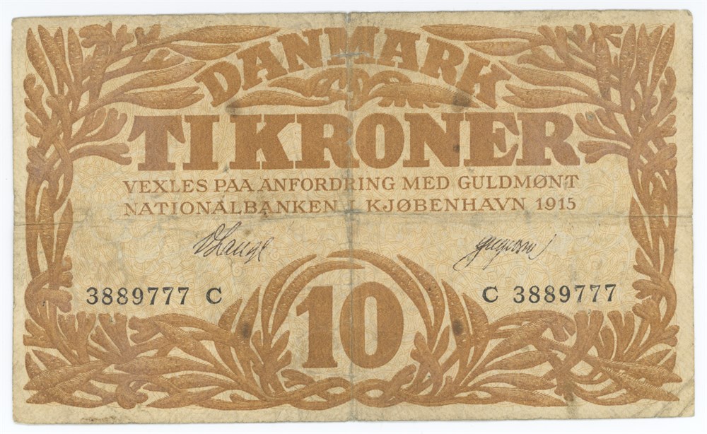 10 kroner 1915 C, nr. 3889777, V. Lange / Gregersen.