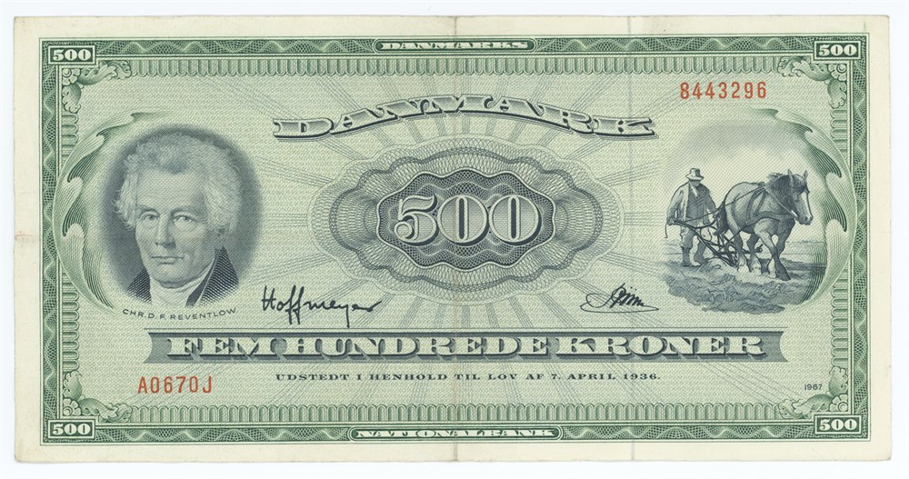 500 kroner 1967 A0 0J, nr. 8443296, Hoffmeyer / Riim.