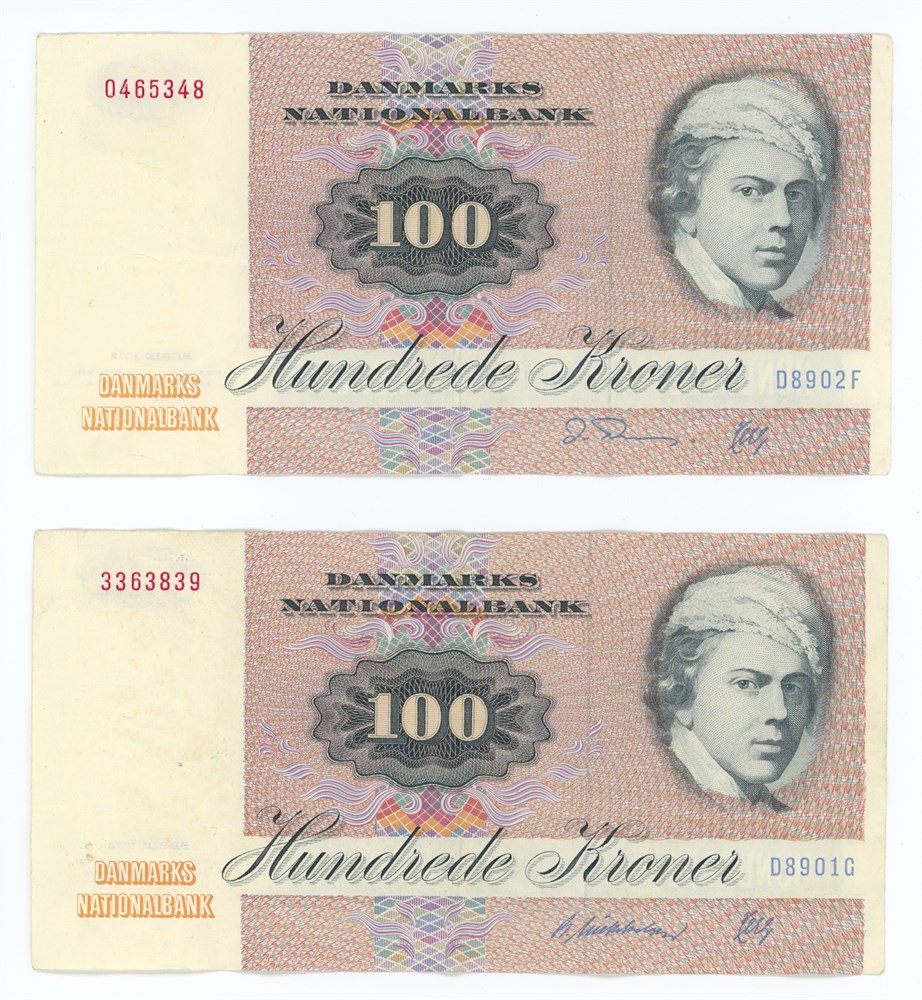 100 kroner 1990 D8, nr. 3363839, R. Mikkelsen / Herly og nr. 0465348, O. Thomasen / Herly. (2)