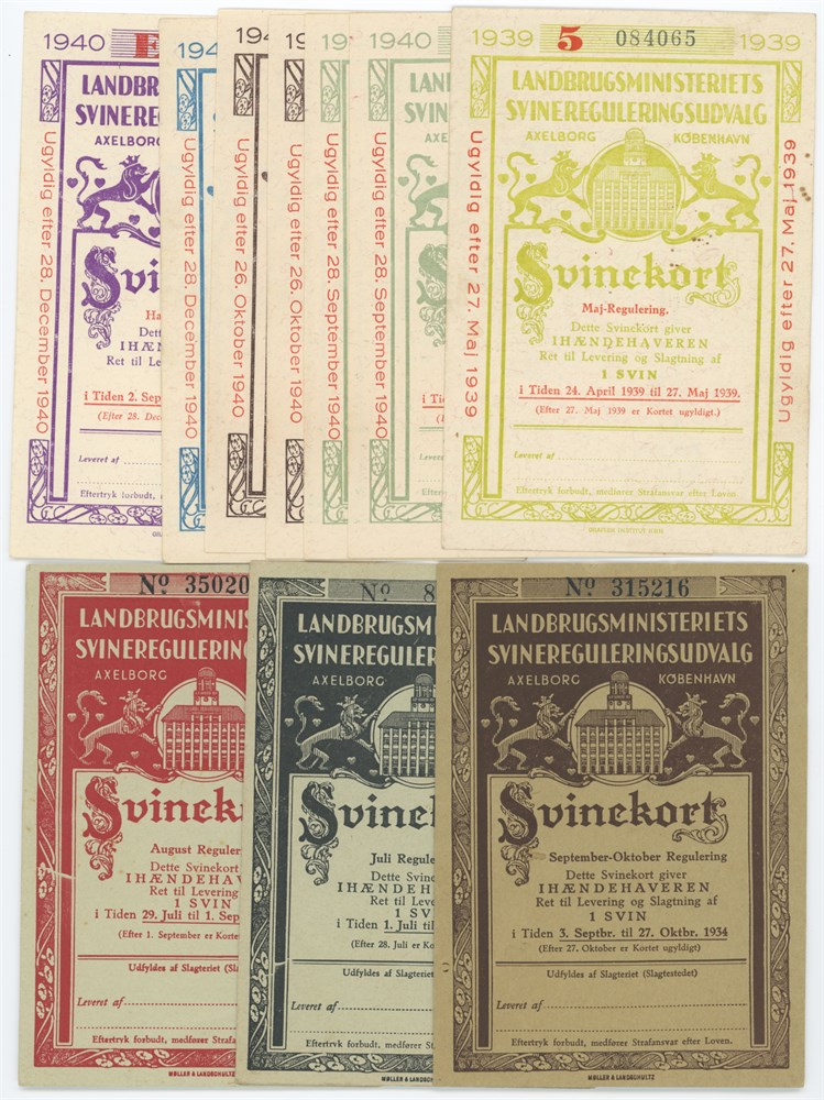 Svinekort, 1934 brun, rød, sort, 1939 gul/grøn, 1940 grøn (2), blå, brun (2), lilla. (10)