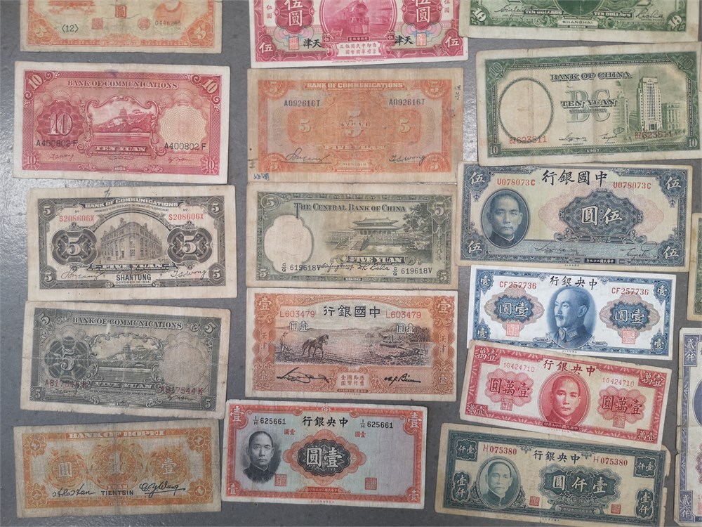 Collection paper money incl. Yuan 1928, 1934, 1935, 1936, 1945; 5 Yuan 1914 (4), 1918, 1927, 1931, 1935 (2), 1936 (3), 1940, 1941, ND (1941); 10 Yuan 1914, 1928 (2), 1930, 1935, 1937 (2), 1940 (2); 10,000 Yuan 1947; 100 custom gold units 1930; 2,000 custom gold units 1947. In total 35 pcs.