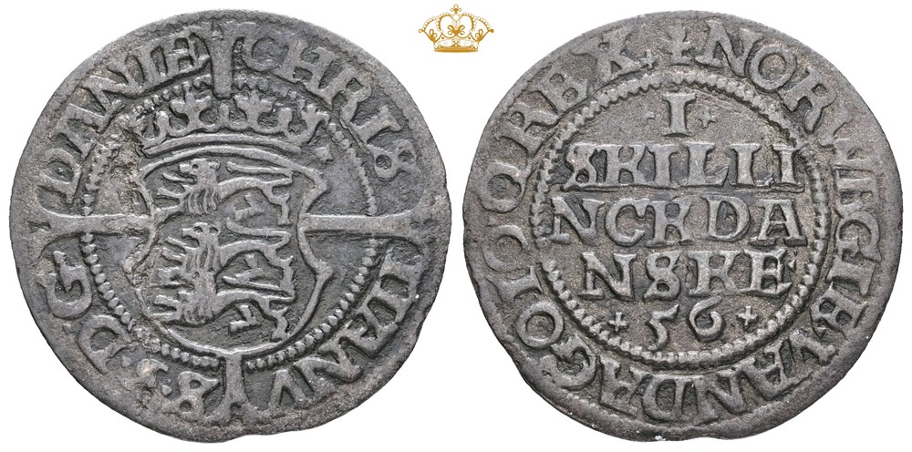 Skilling 1556. Let korr. Schou 2 med små kors på hver side af kronen.
