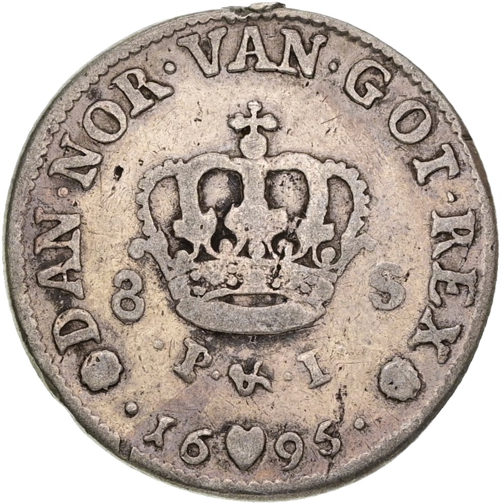 8 skilling 1695, har været hængt - ualmindelig variant med 'DEI GRAT'.