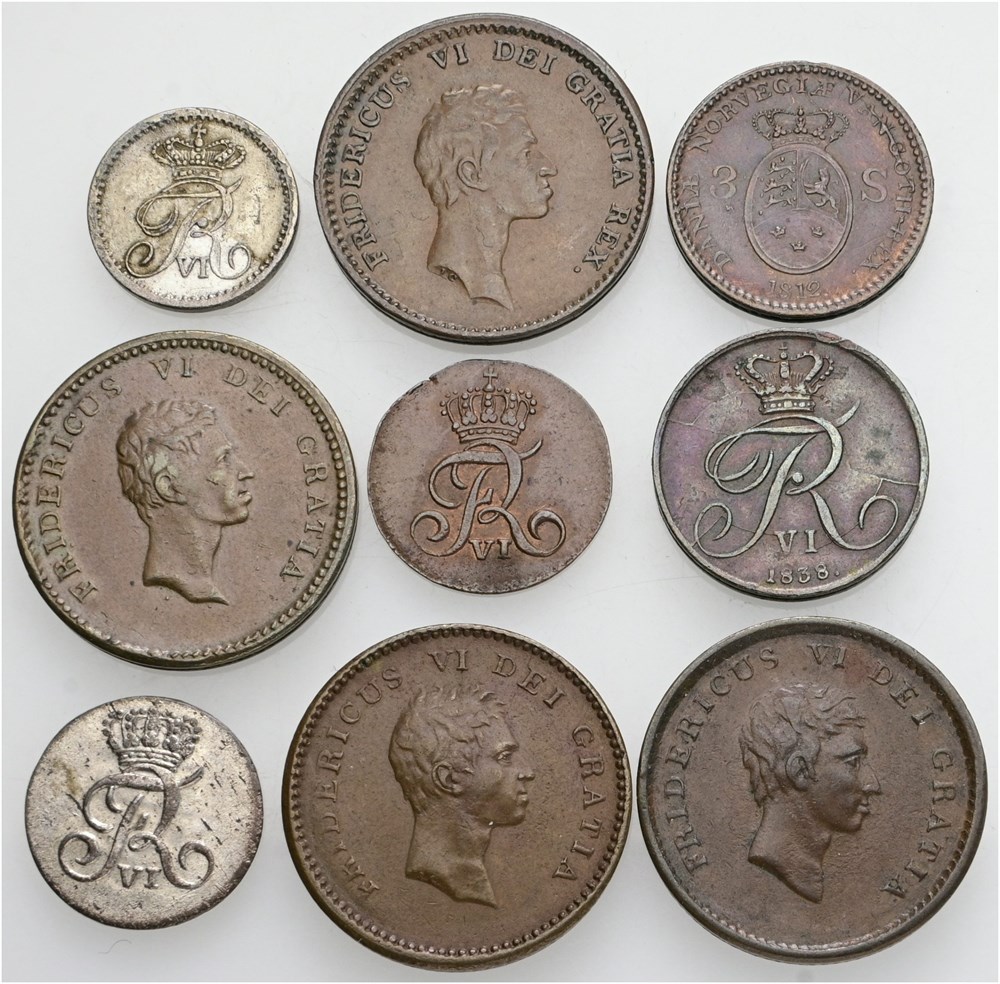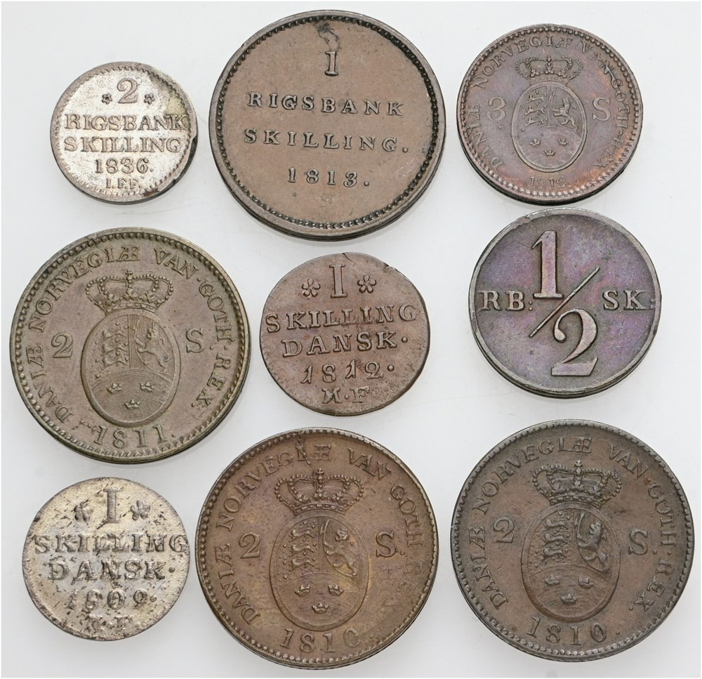 Skilling 1809, 1812; 2 skilling 1810, 1810, 1811; 3 skilling 1812; 1/2 rigsbankskilling 1838; rigsbankskilling 1813; 2 rigsbankskilling 1836. (9)
