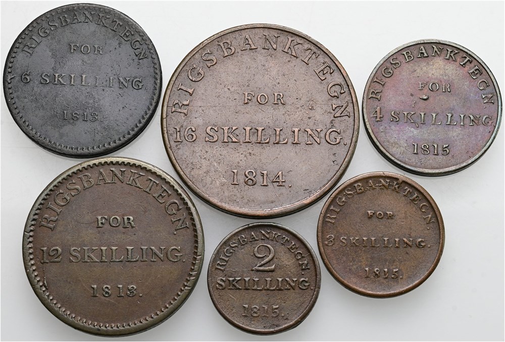 Rigsbanktegn for 2 skilling 1815, 3 skilling 1815, 4 skilling 1815, 6 skilling 1813, 12 skilling 1813, 16 skilling 1814. 12 skilling med 'ghosting' hvor omridset af våbenskjoldet kan anes på bagsiden. (6)