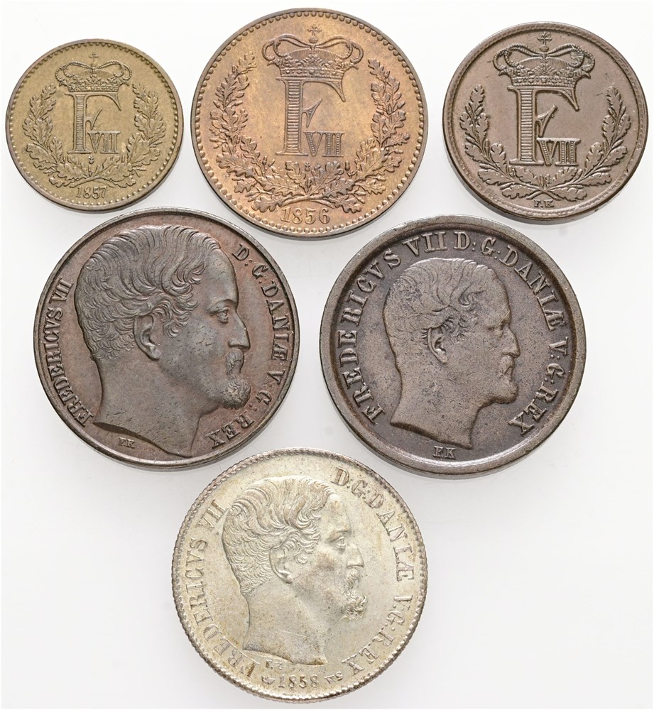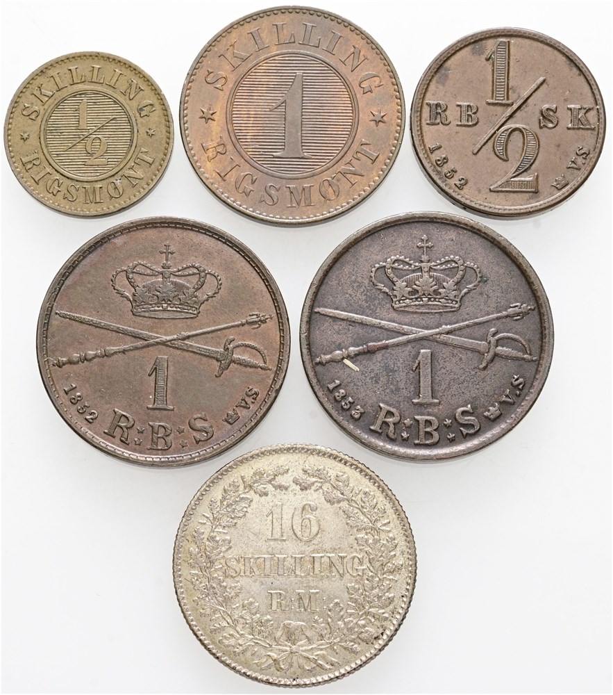 1/2 rigsbankskilling 1852; rigsbankskilling 1852, 1853; 1/2 skilling 1857; skilling 1856; 16 skilling 1858. (6)