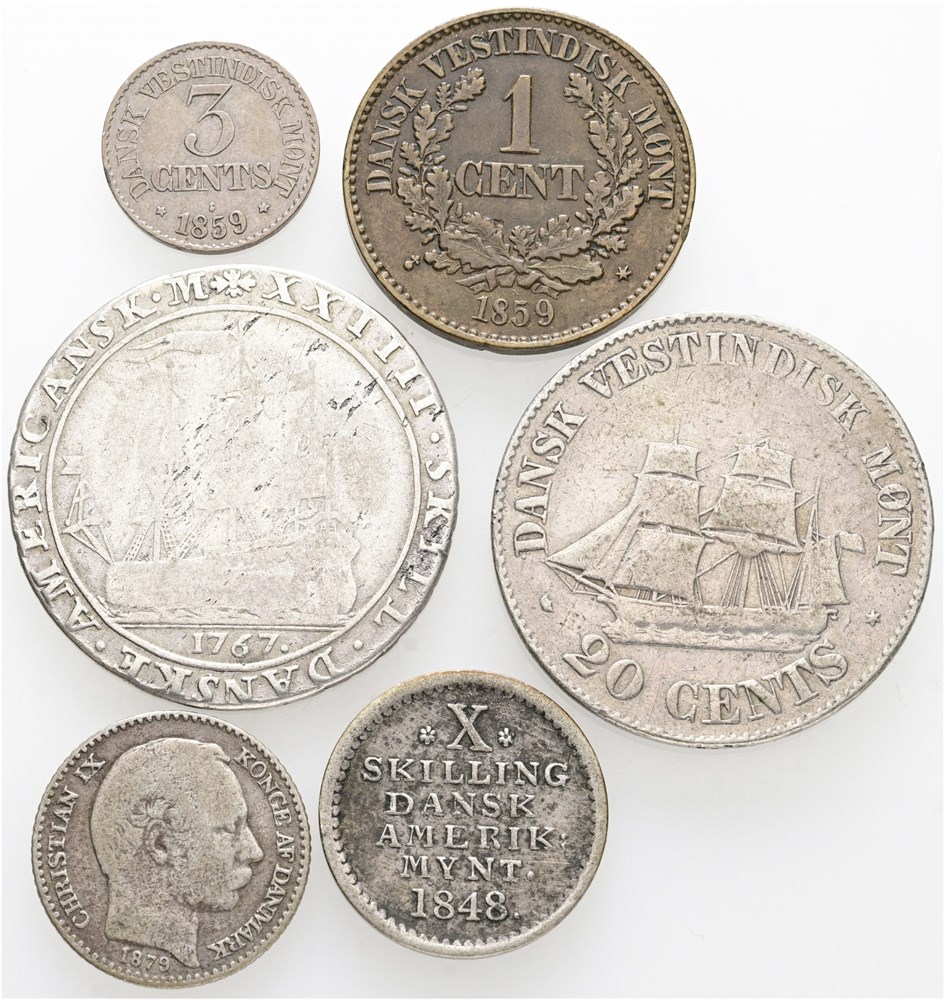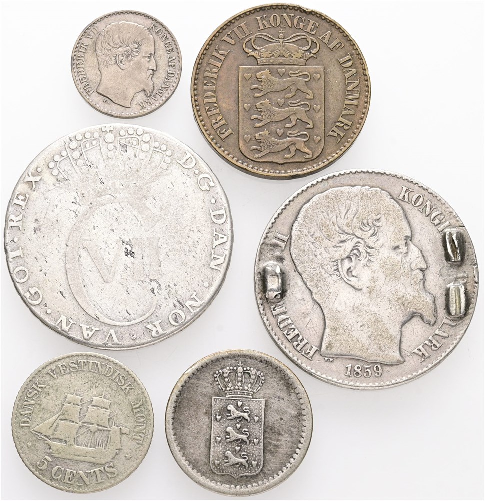 10 skilling 1848; 24 skilling 1767; 1 cent 1859; 3 cents 1859; 5 cents 1879; 20 cents 1859, monteringsspor. (6)
