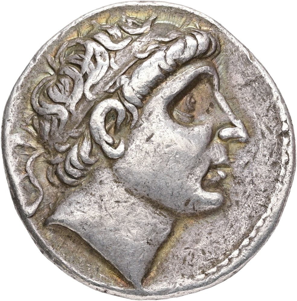Tetradrachm. Diademed head of Antiochos I to right. Rev. ΒAΣΛΕΩΣ - ANTIOXOY Apollo seated left on omphalos, with arrow held in his right hand and resting his left on bow set on ground.