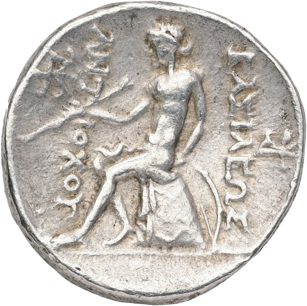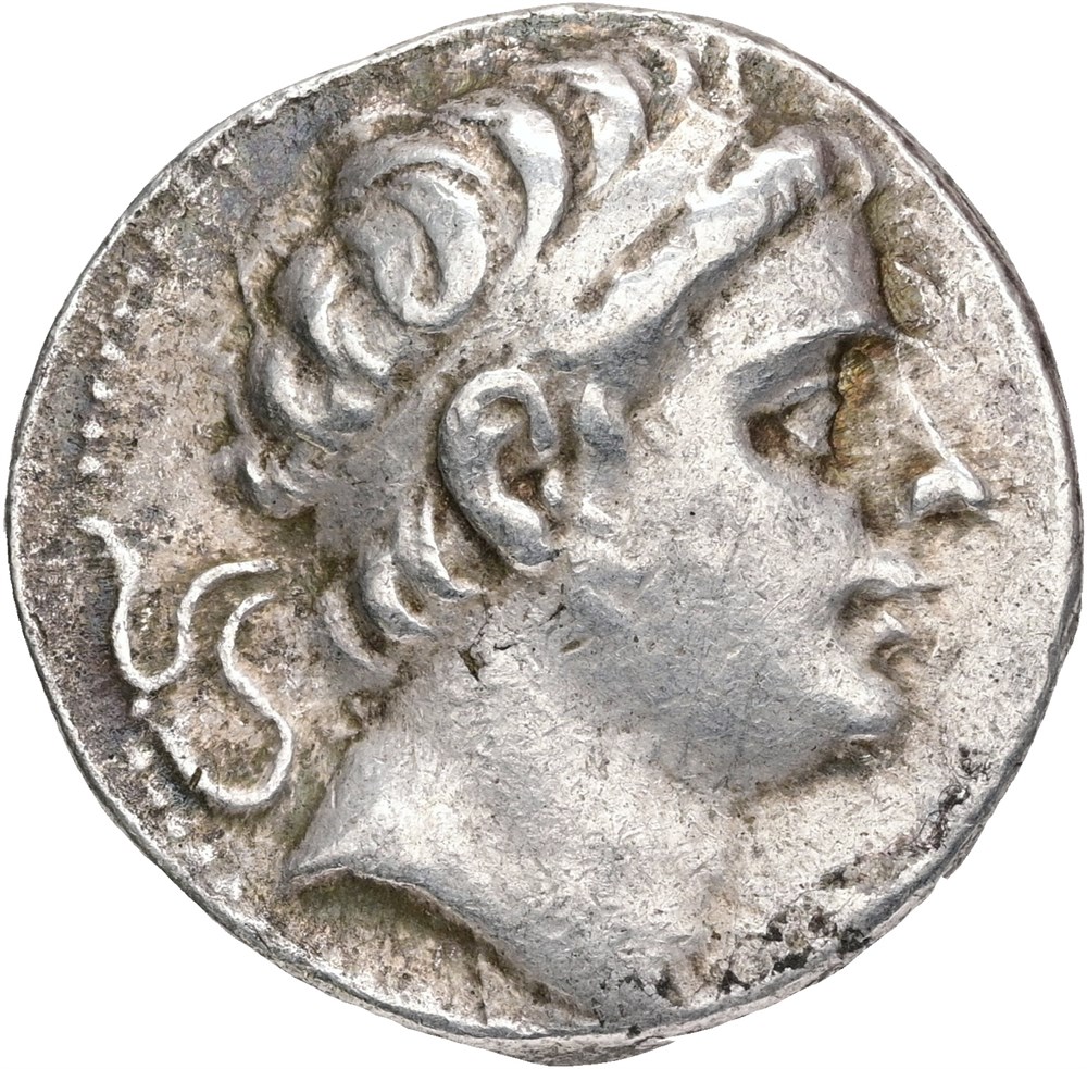 Tetradrachm. Diademed head of Antiochos I to right. Rev. ΒAΣΛΕΩΣ - ANTIOXOY Apollo seated left on omphalos, with arrow held in his right hand and resting his left on bow set on ground.