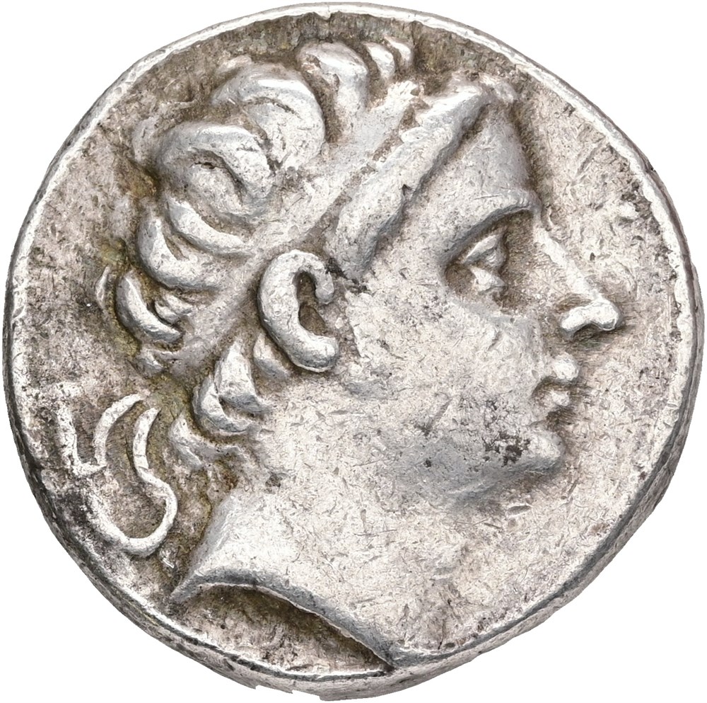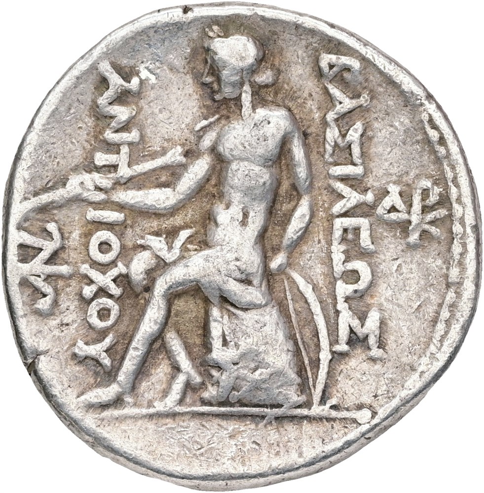Tetradrachm. Diademed head of Antiochos I to right. Rev. ΒAΣΛΕΩΣ - ANTIOXOY Apollo seated left on omphalos, with arrow held in his right hand and resting his left on bow set on ground.