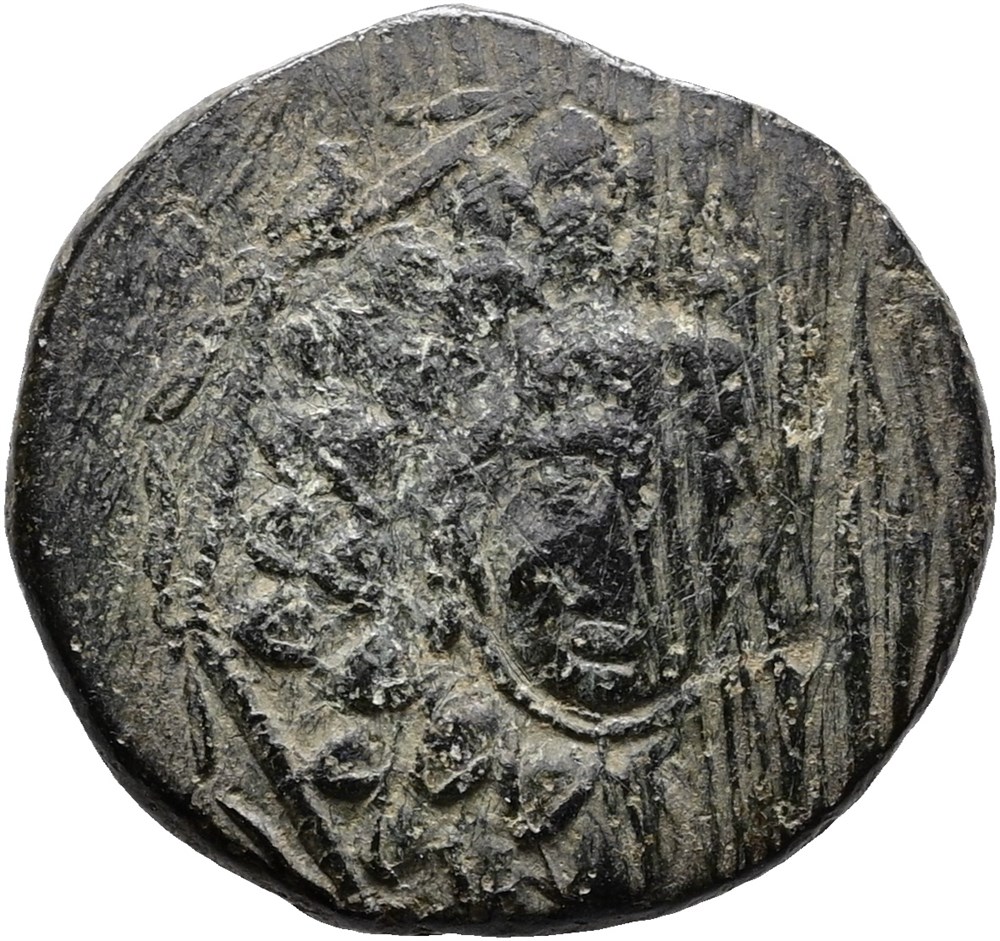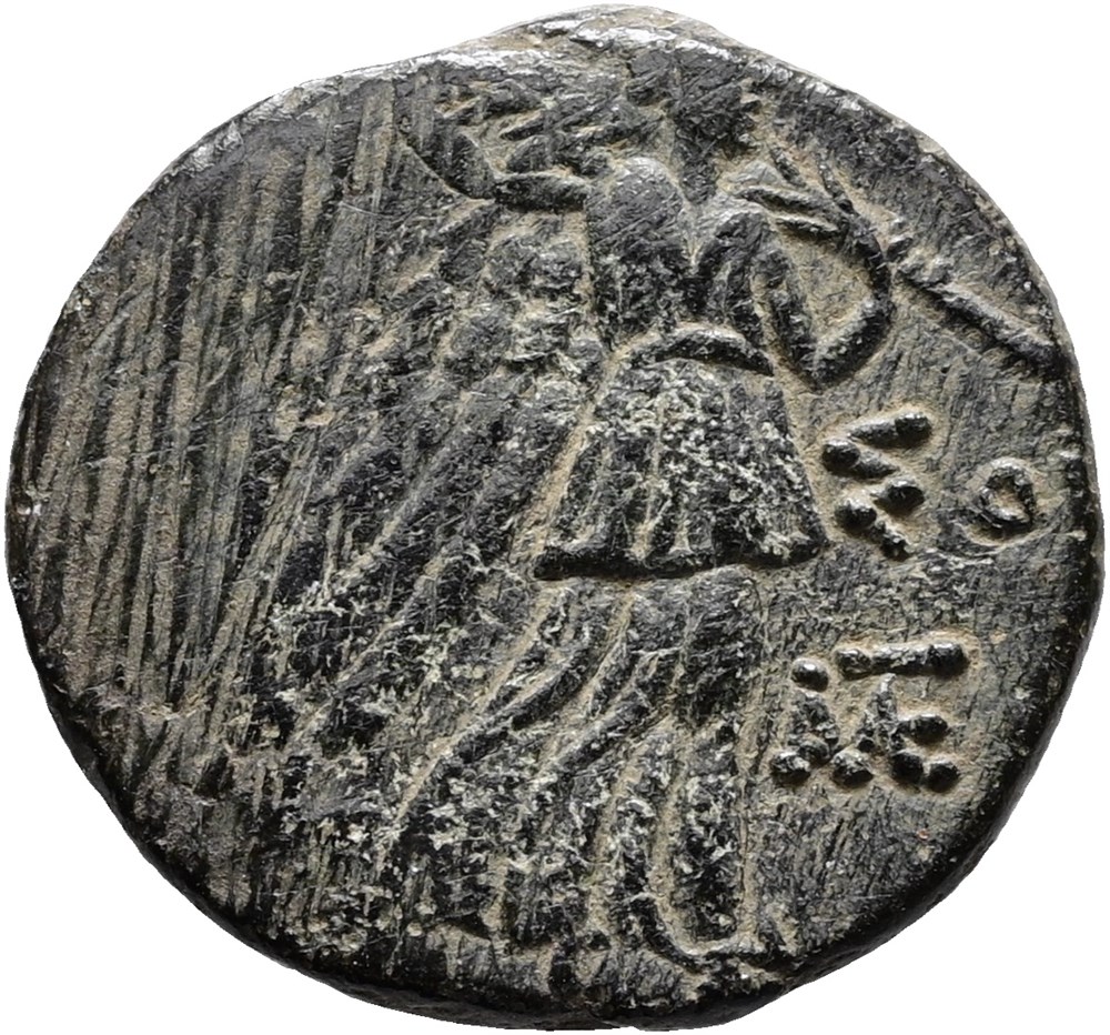 Bronze, 21 mm, facing head of Medusa / Nike advancing right holding palm branch.