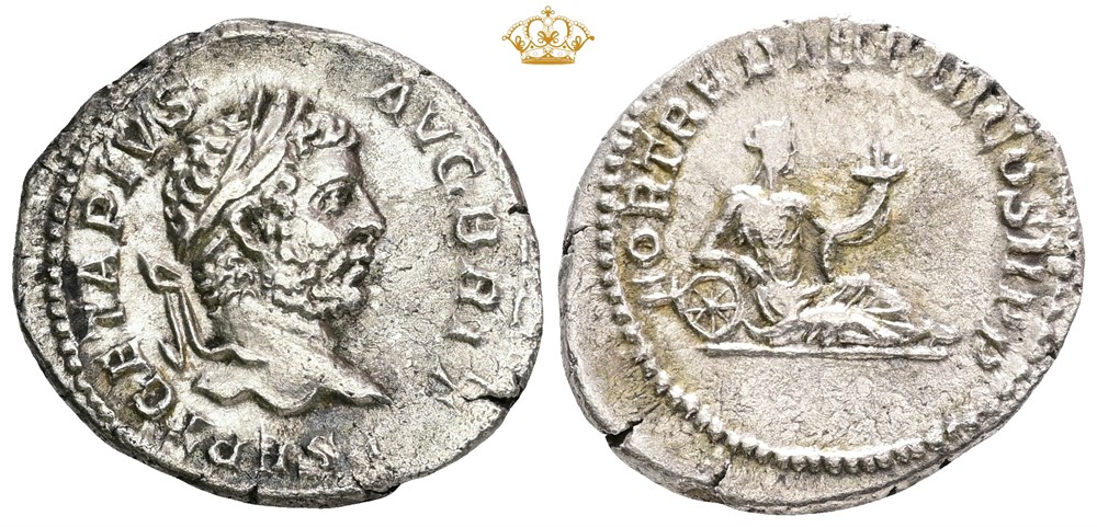 Denarius, 211 AD, P SEPT GETA PIVS AVG BRIT Laureate head of Geta to right. Rev. FORT RED TR P III COS II P P Fortuna reclining right, resting her right elbow on wheel set on ground and holding cornucopiae in her left hand.